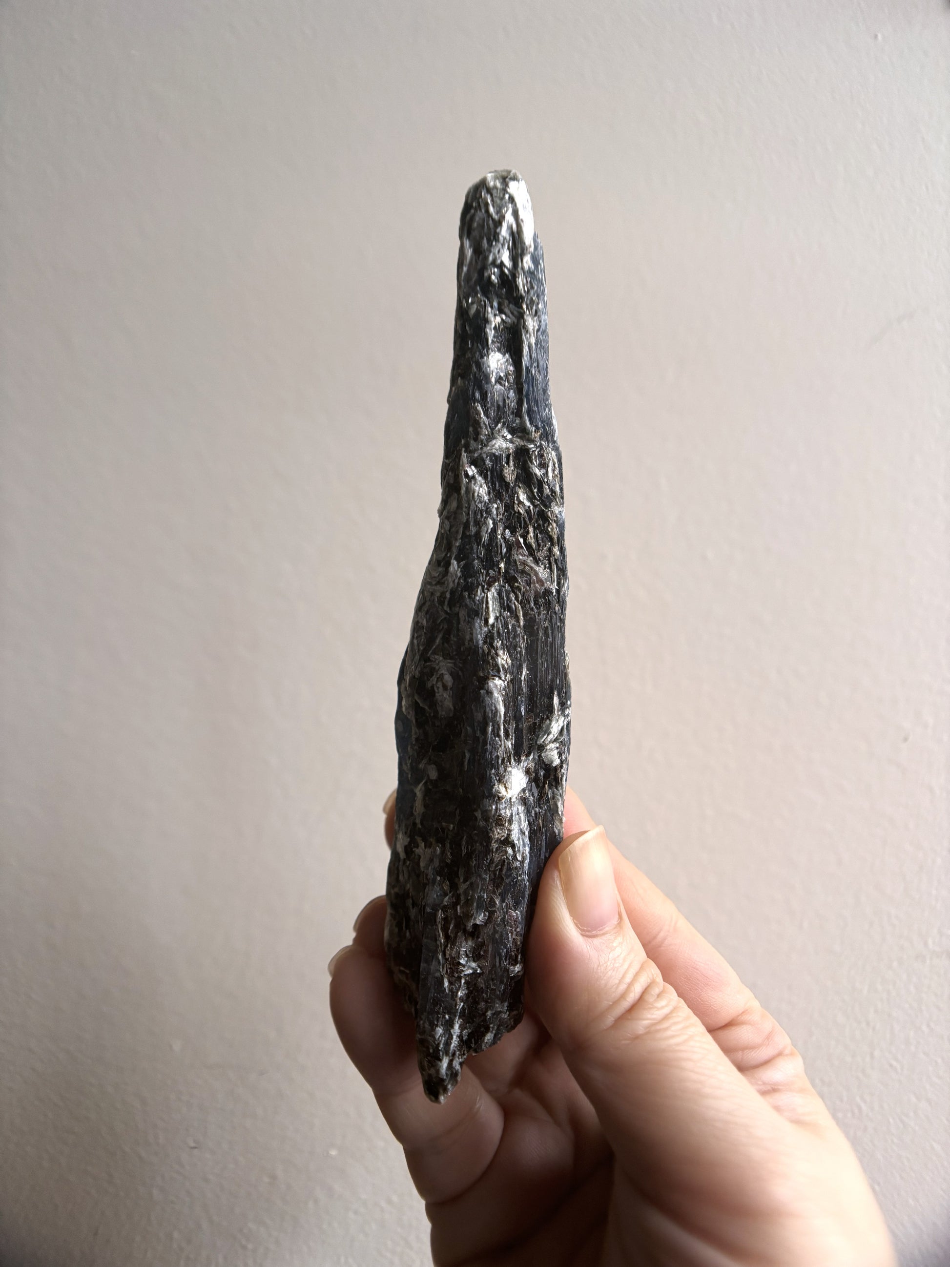 Blue Kyanite with Mica exposes the patterns you have been running on autopilot, especially the ones you have outgrown. Its reflective layers pull buried truths to the surface, while the Kyanite cuts through mental fog with clean, uncompromising honesty. This stone strengthens your ability to discern what is real from what is reactive, keeping your voice steady and your thinking sharp. With it, you begin making decisions from clarity, not confusion and move forward with a mind that no longer betrays you.