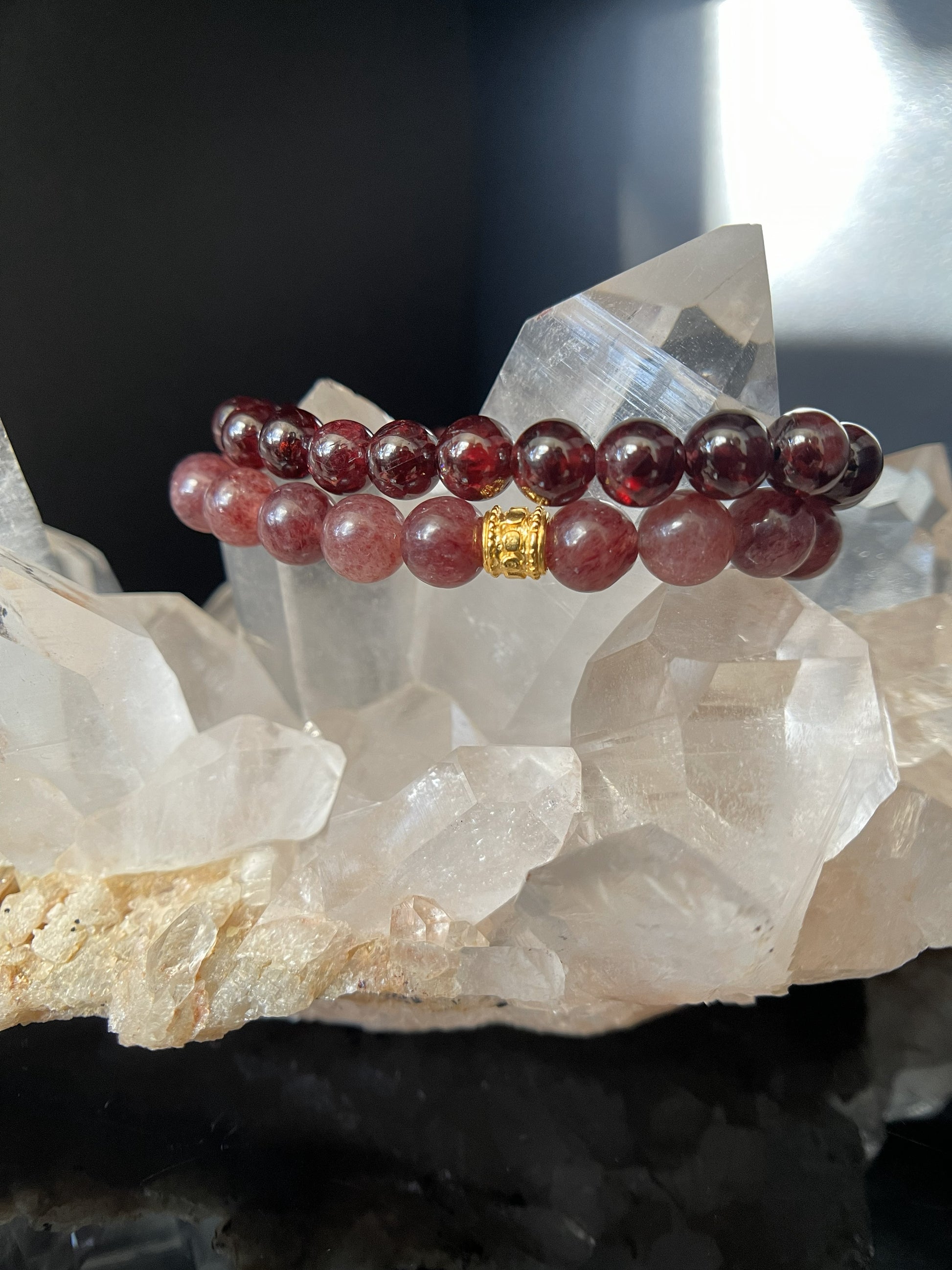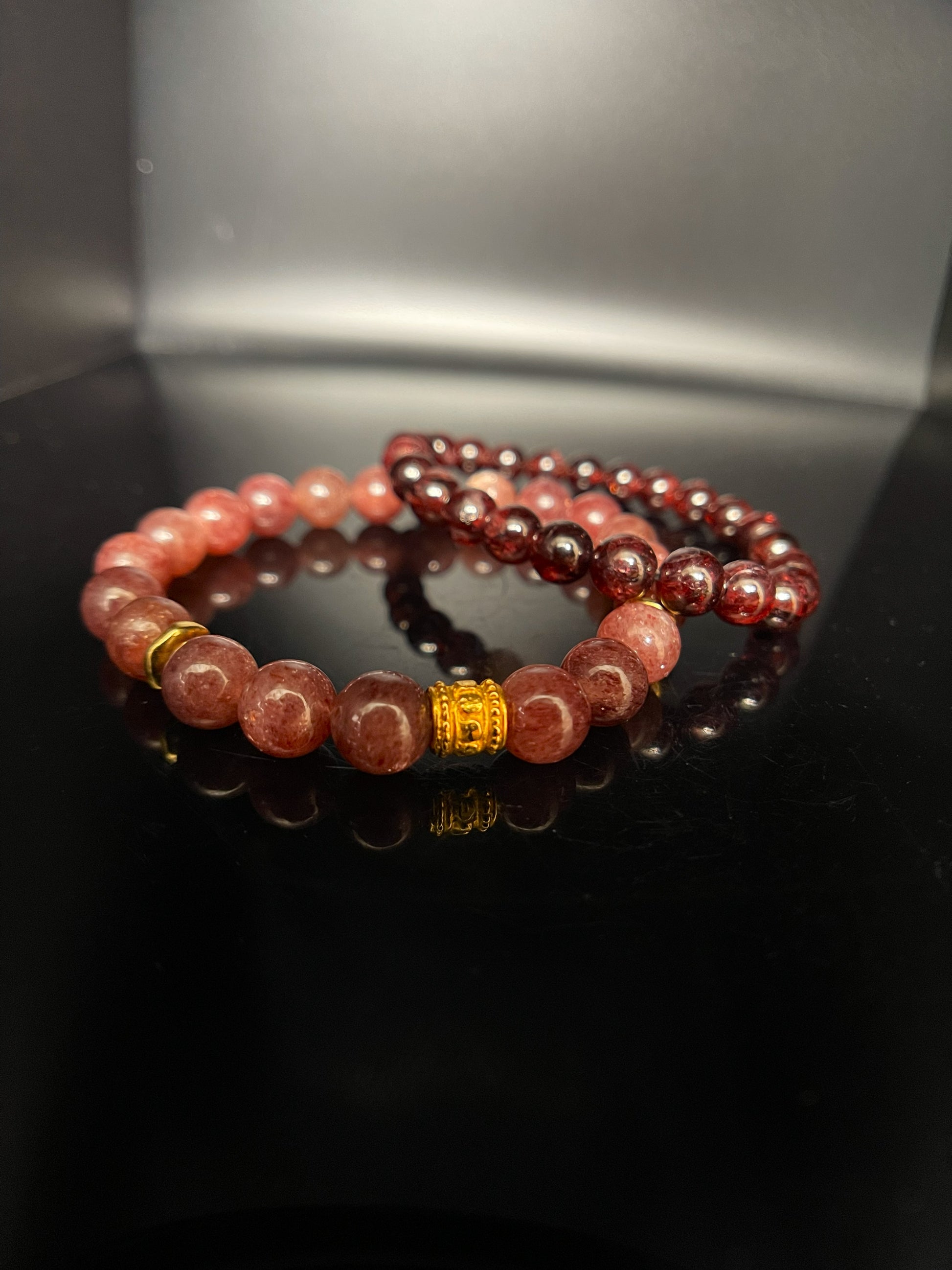 Strawberry Quartz carries a softness often underestimated, reflecting humility while revealing the depth others sense but rarely see. Garnet is the inner summons, a steady flame that restores courage without stripping grace. This pair honors those who have carried weight quietly, drawing out the depth that was always within and guiding the path toward a life shaped by grace and radiant purpose, rising with true intention.