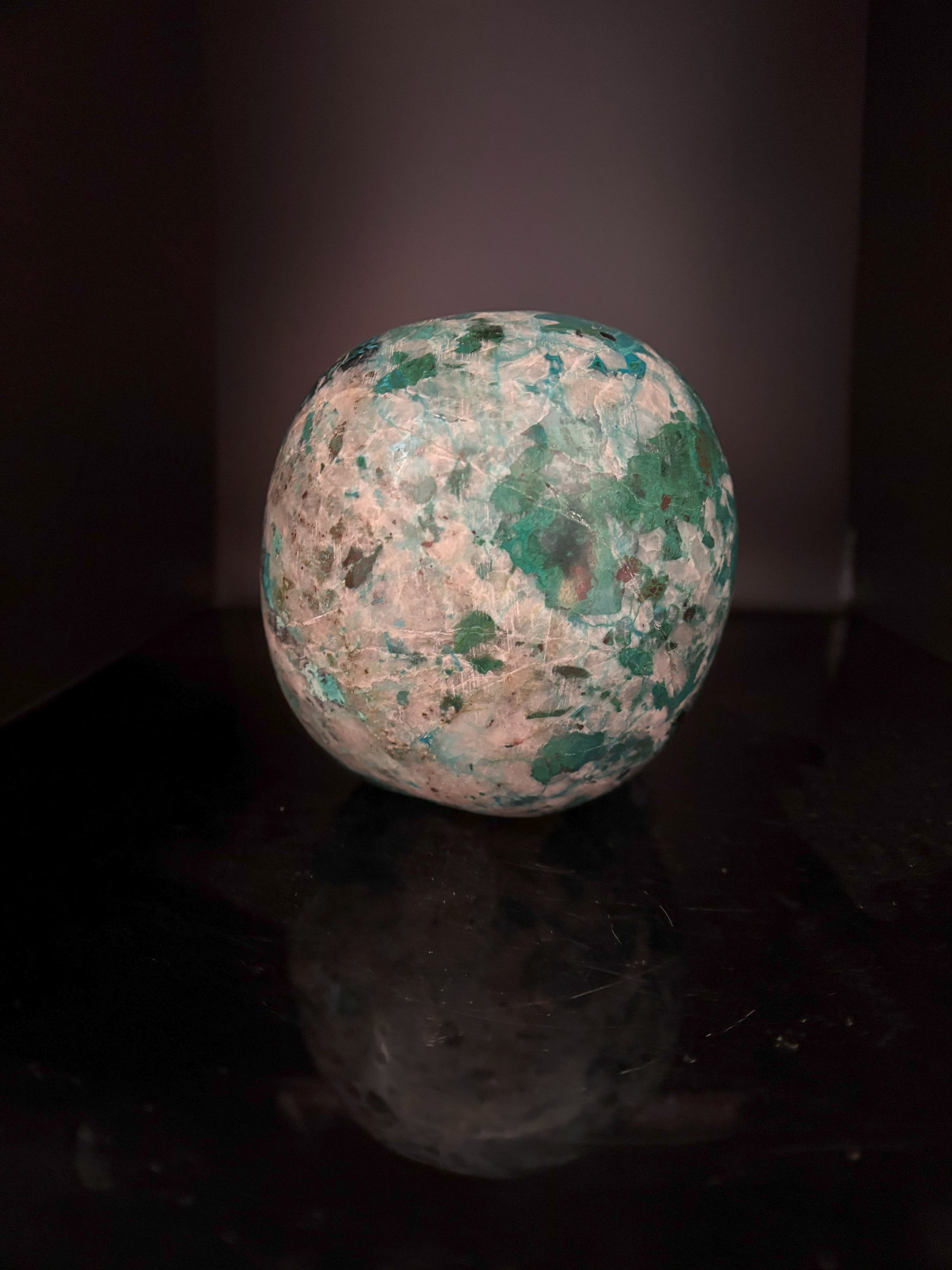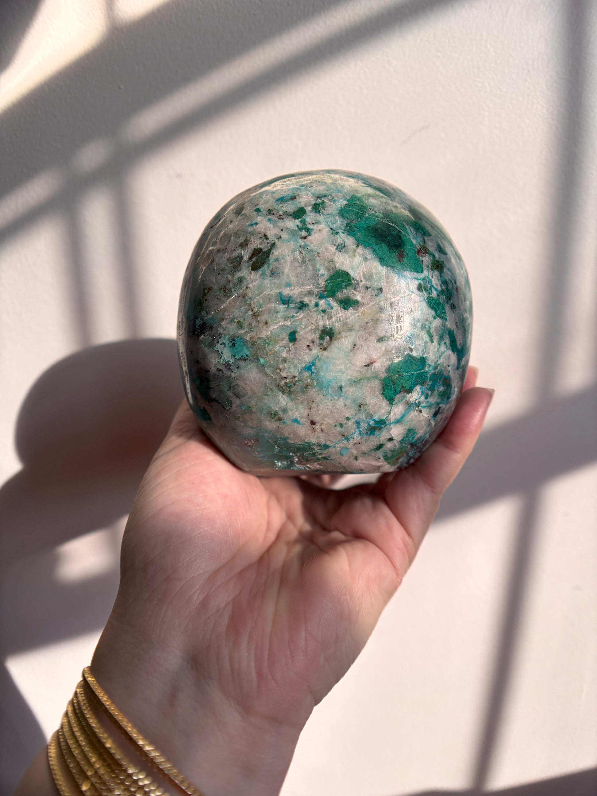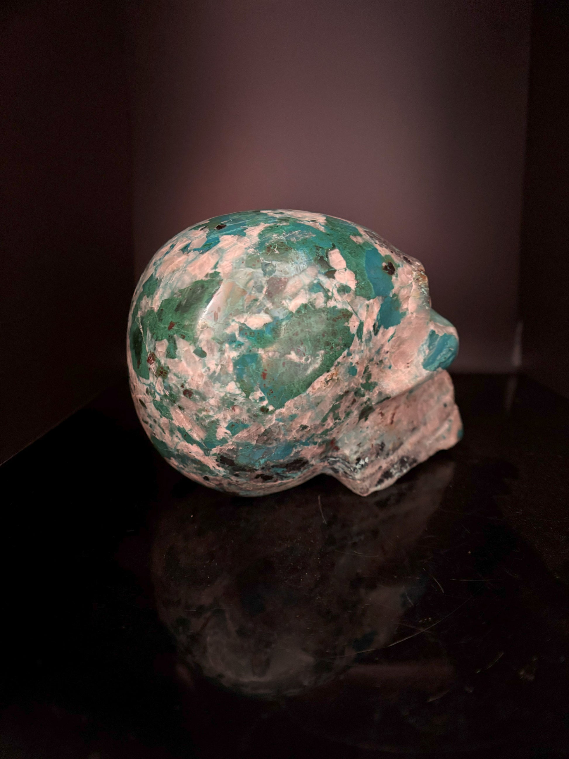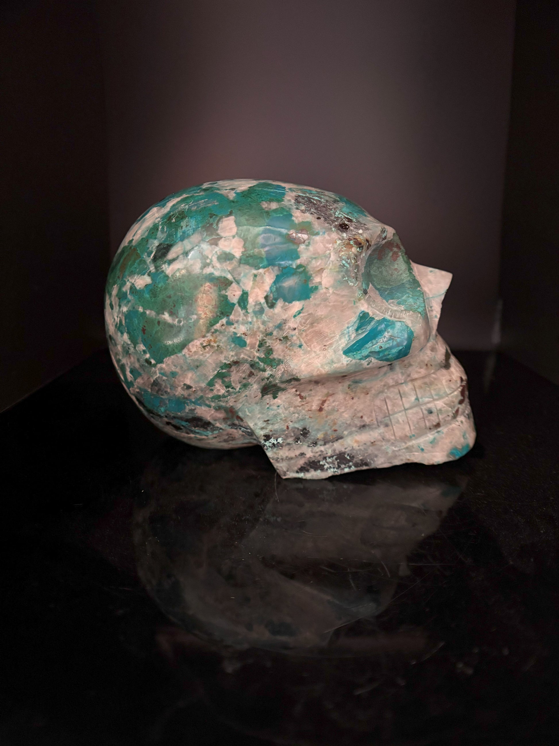 This Chrysocolla and Quartz Skull holds the wisdom of stone and spirit, guiding you to speak with clarity, purpose, and power. Chrysocolla awakens your awareness of the energy behind your words—helping you communicate with emotional intelligence, ancestral grace, and conscious intention. Quartz amplifies this frequency, sharpening your intuition and strengthening the energetic field around your thoughts. Carved into the form of a skull, it becomes a keeper of knowledge—an ancient companion to help you channel truth, carry wisdom, and walk with calm authority.
