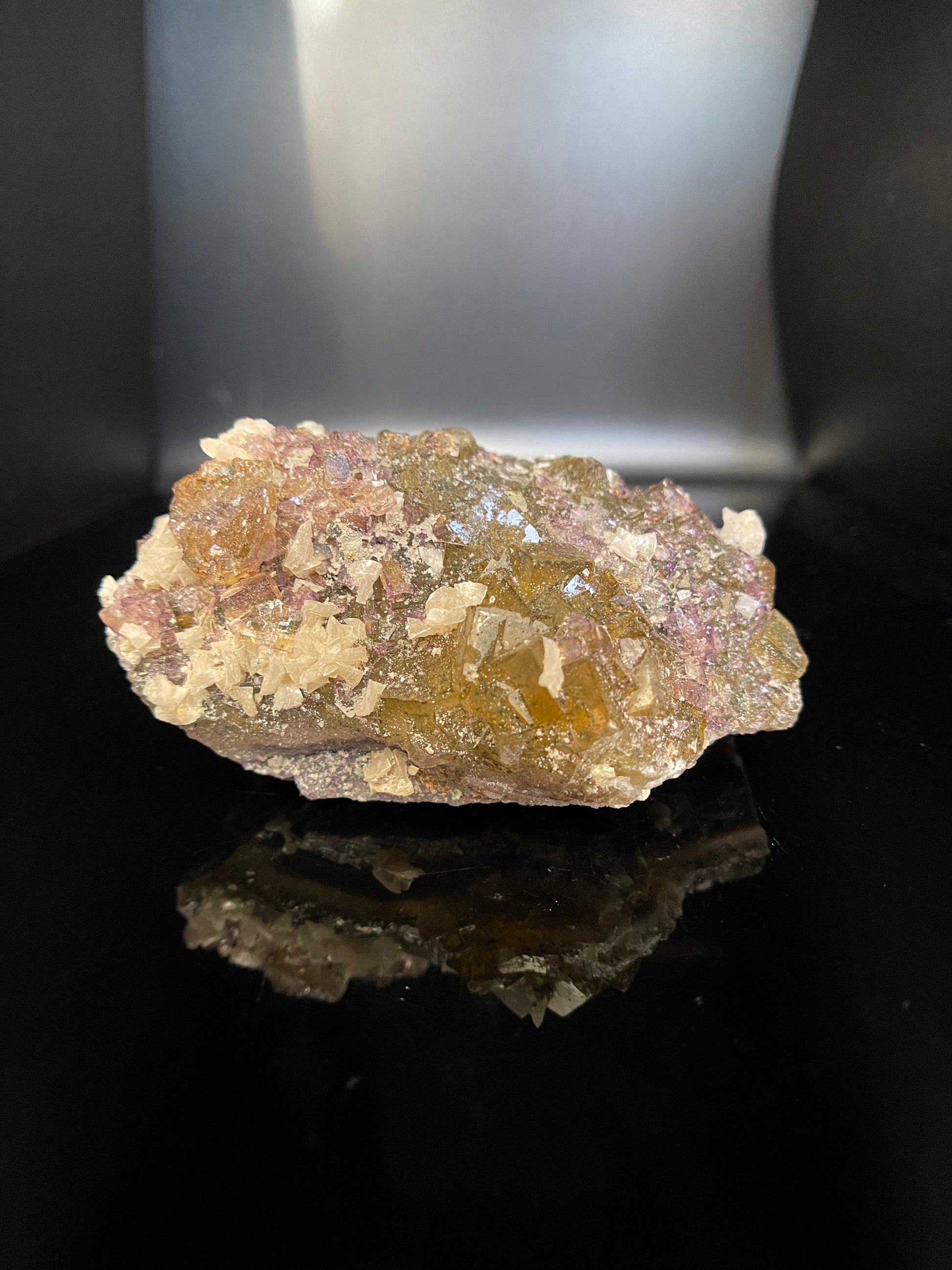This Spanish fluorite from the Moscano mine is mixed with Baryte, Calcite, and Pyrite.