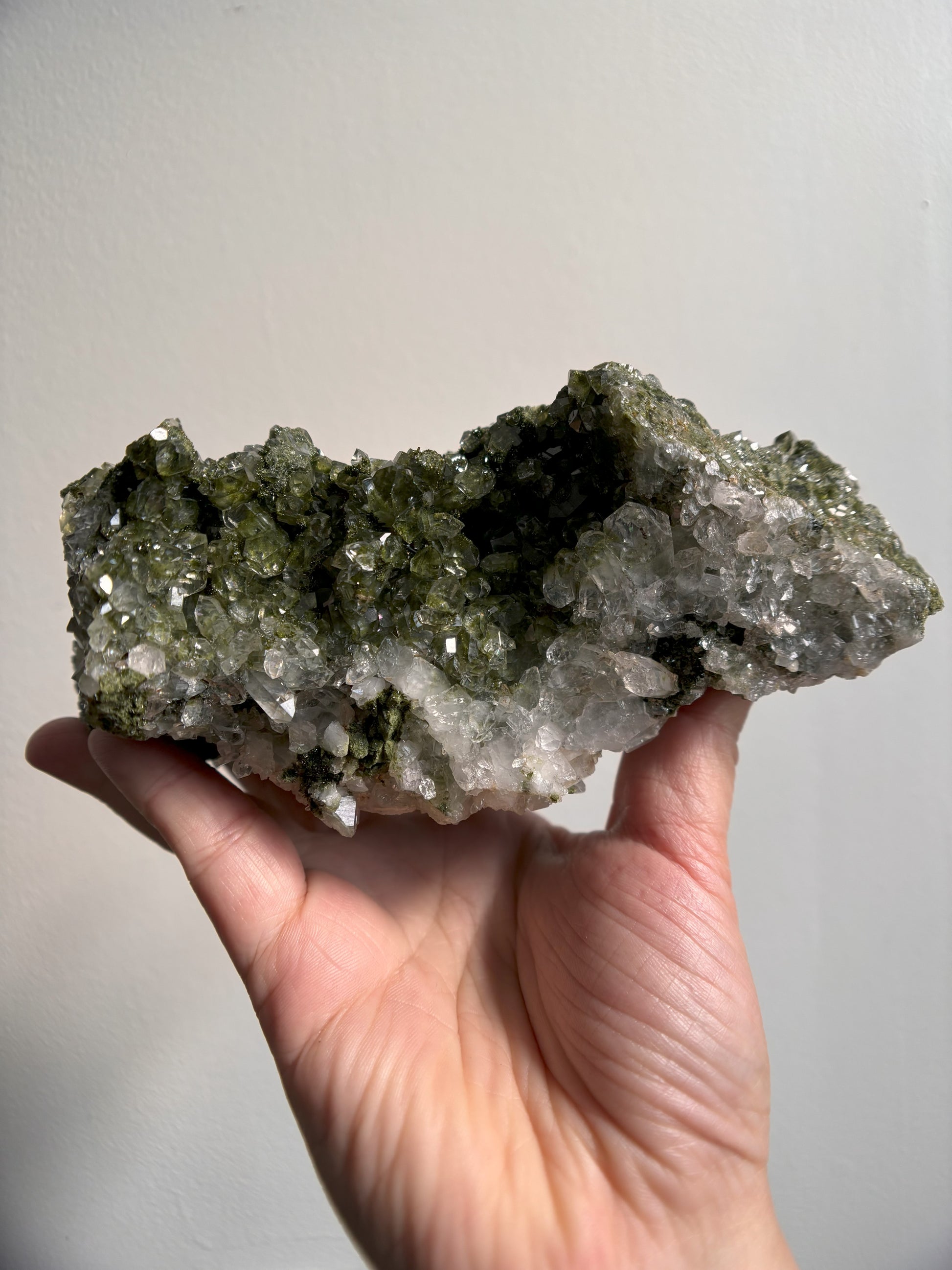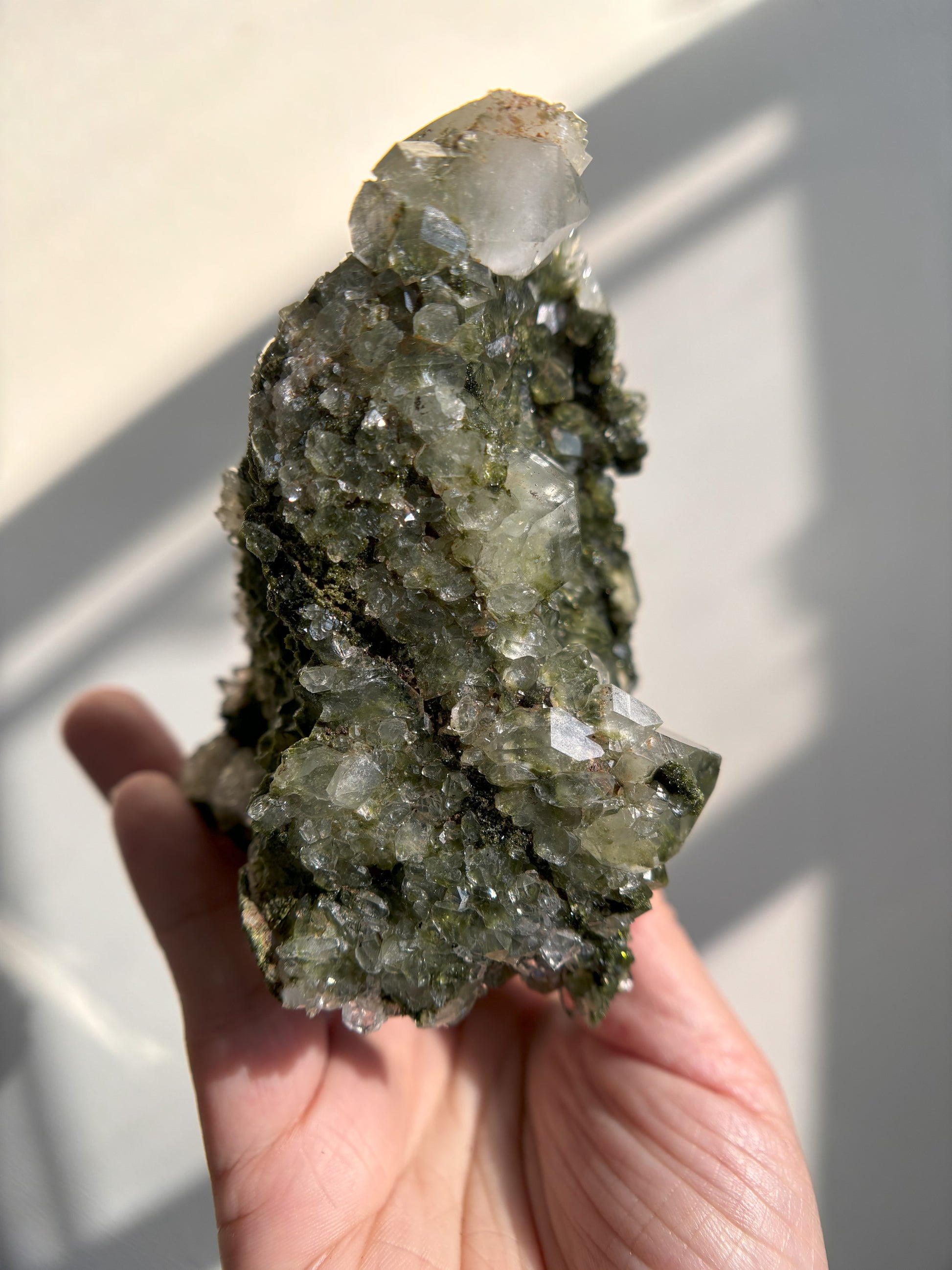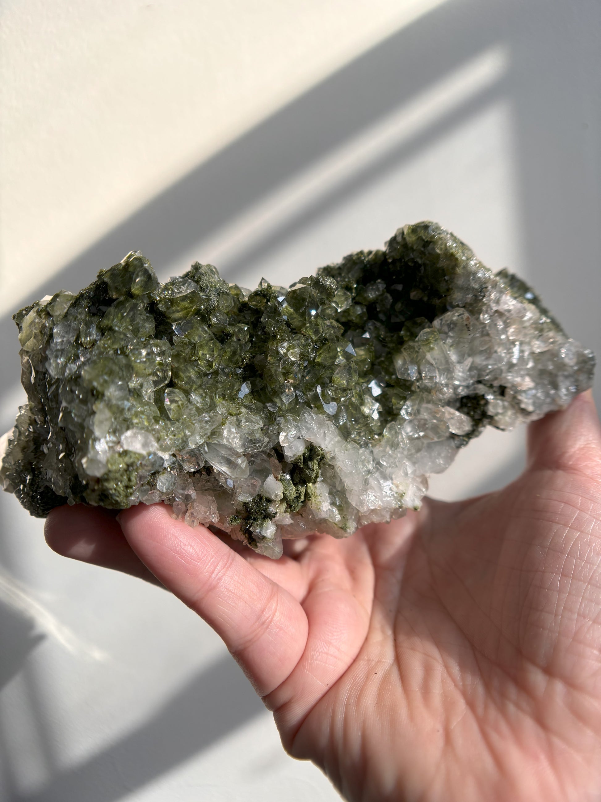 Epidote is a crystal of amplification and release, urging you to clear the debris of self-doubt and make room for abundance. Its deep forest green glimmers like ancient earth, steady and grounded. It will magnifying whatever energy you carry and challenging you to choose growth, gratitude, and courage. In this high-grade form, it acts as a sacred mirror: bright, sharp, and unwavering, reflecting back the truth of who you are and helping you rise as the boldest version of yourself.