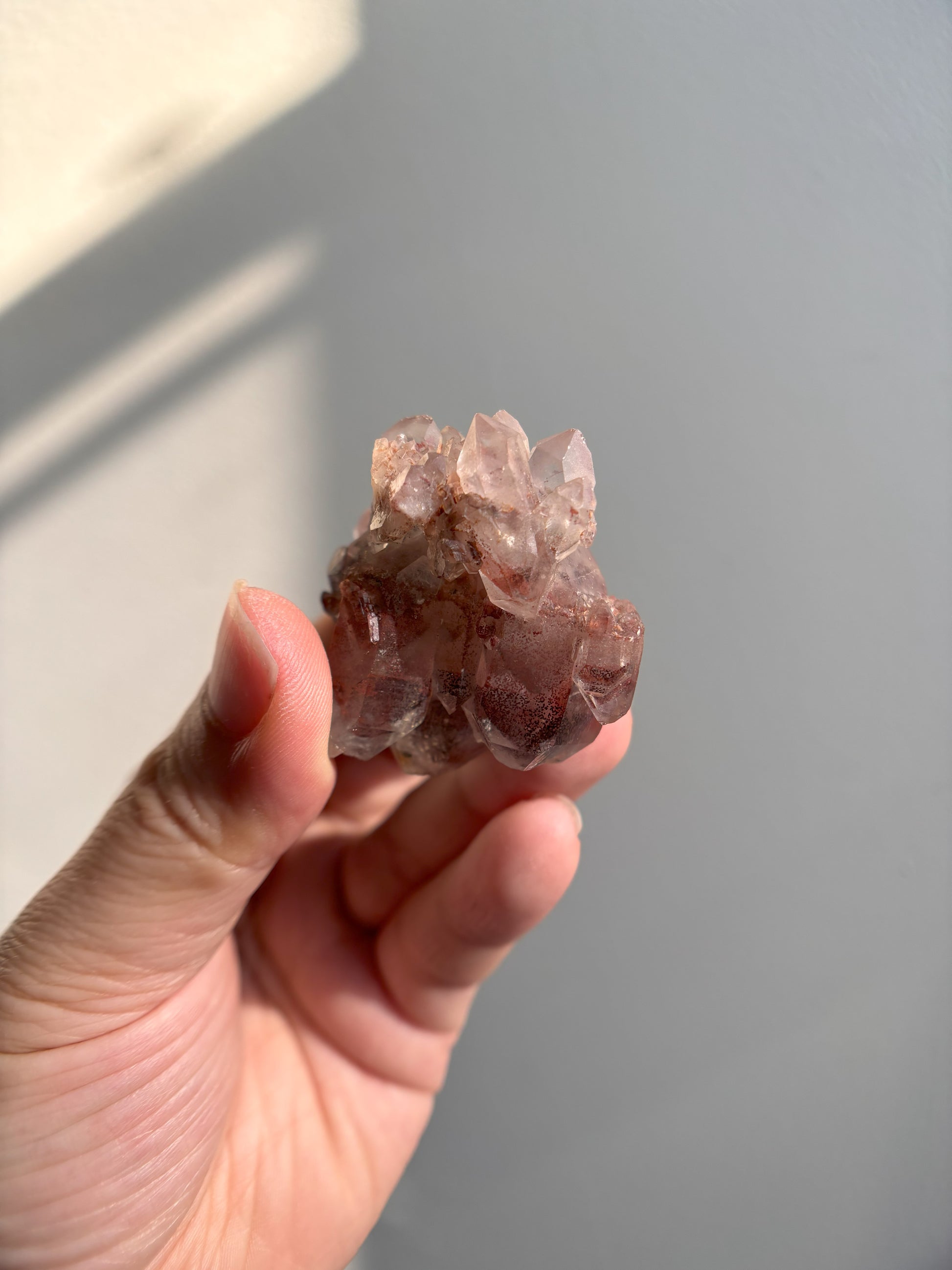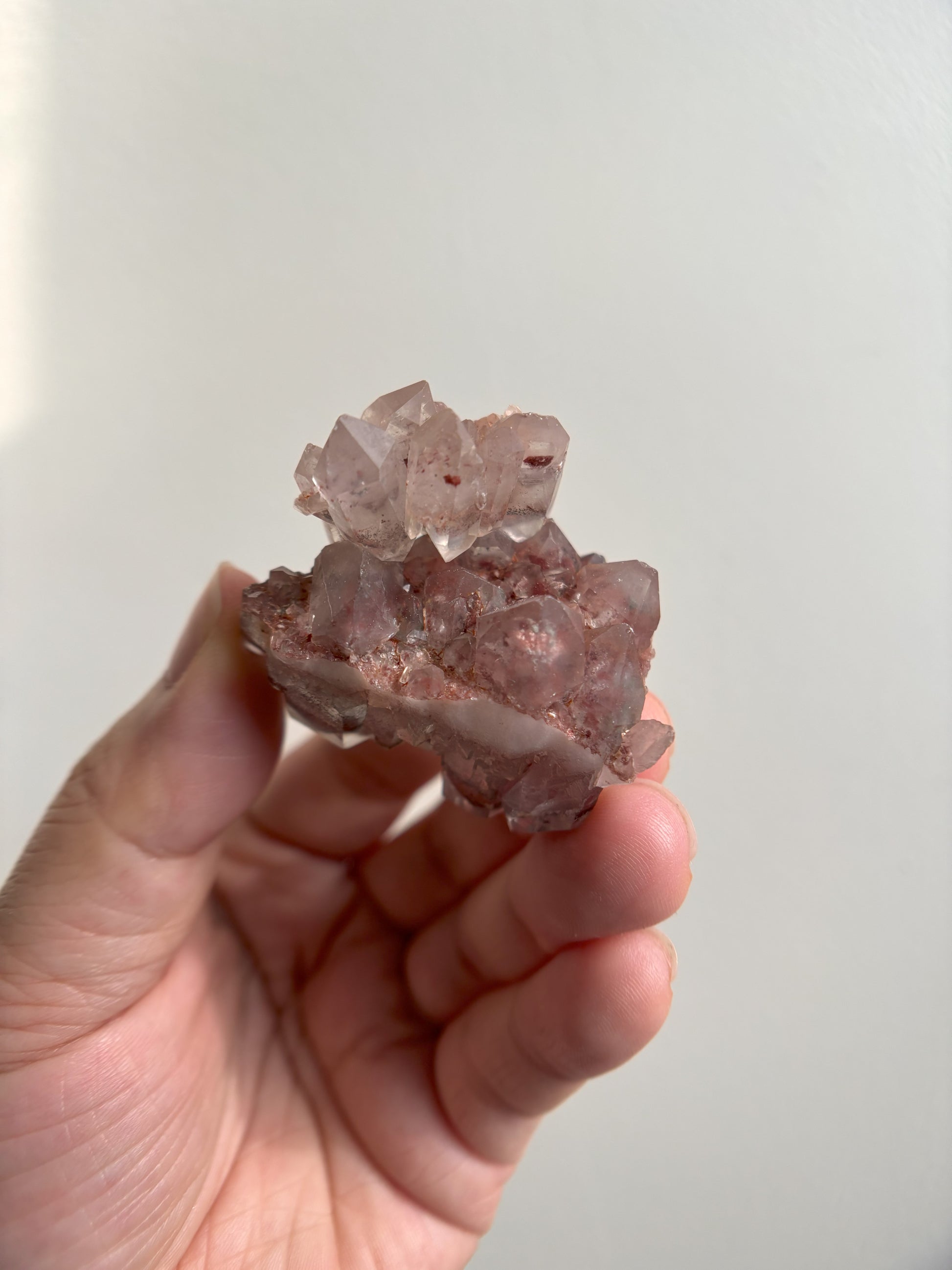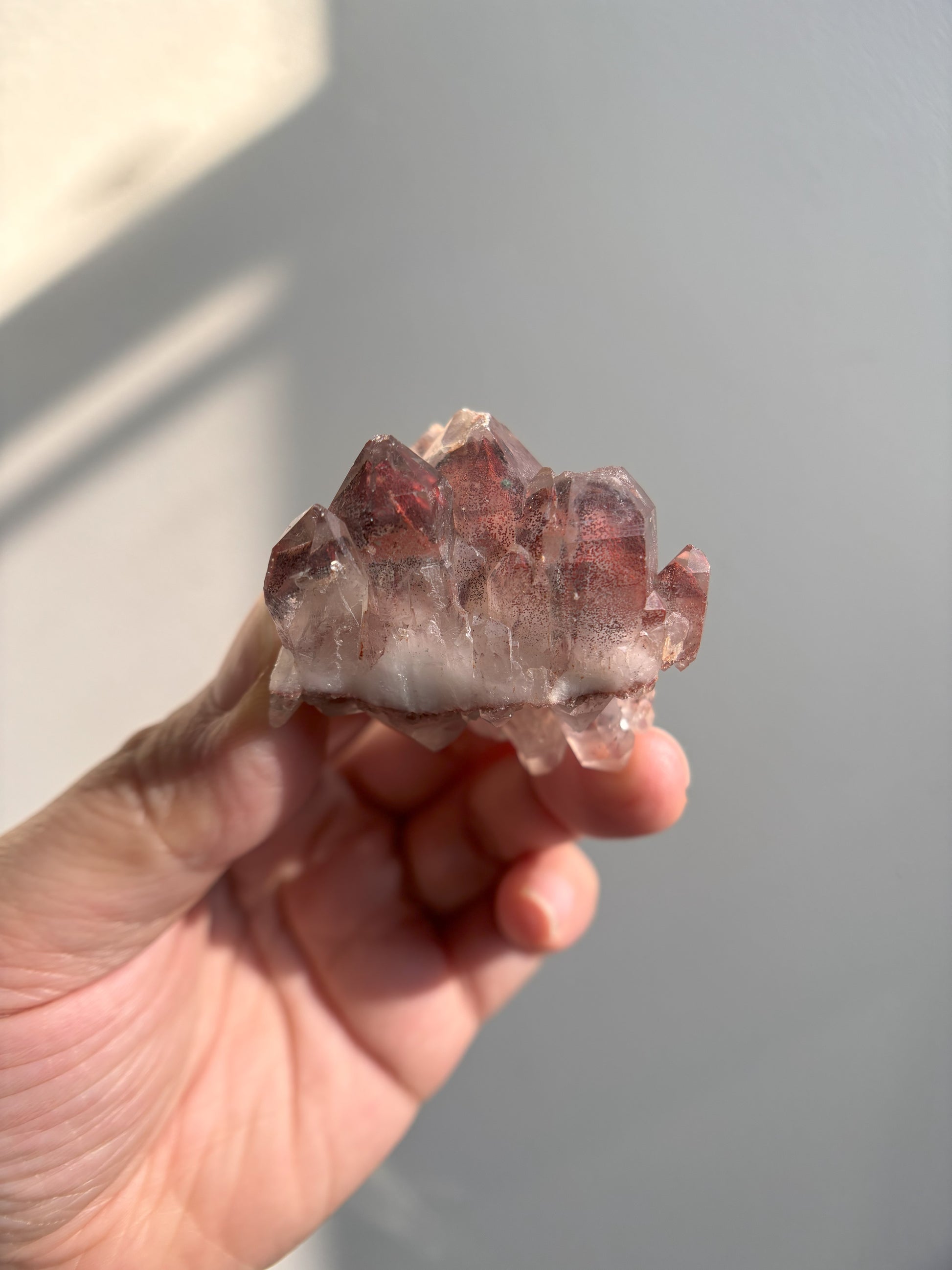 This Red Phantom Quartz, named "Ishuko," draws its fiery power from the red hematite inclusions, symbolizing the flames of one's transformation and inner strength. Ishuko reminds you that like a fireplace, your core holds an eternal fire, capable of burning away the old and igniting new life and direction.