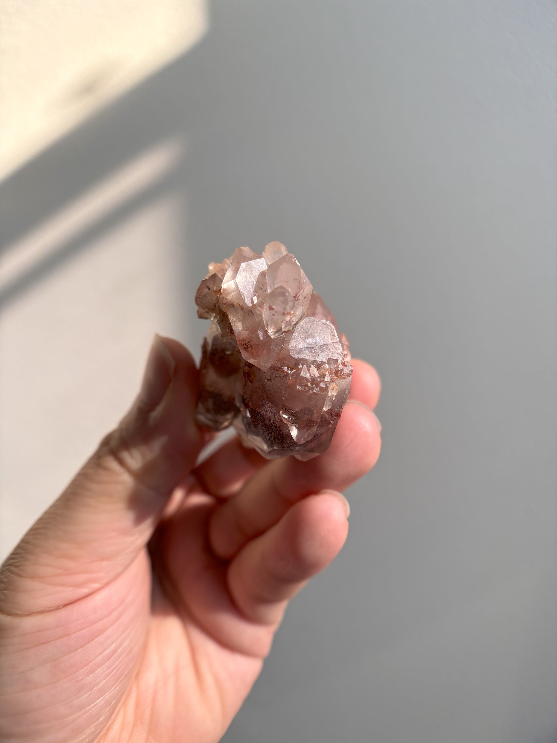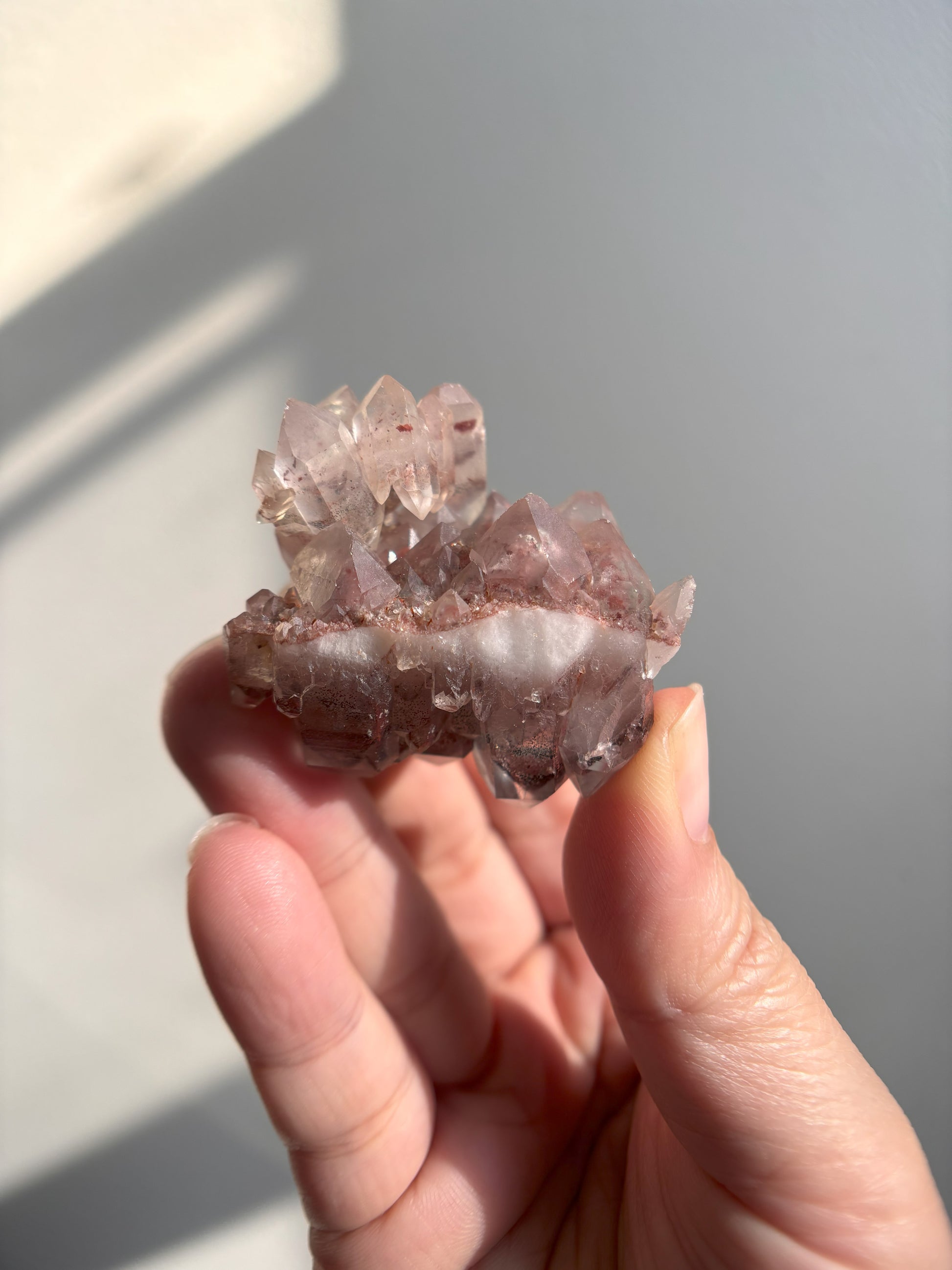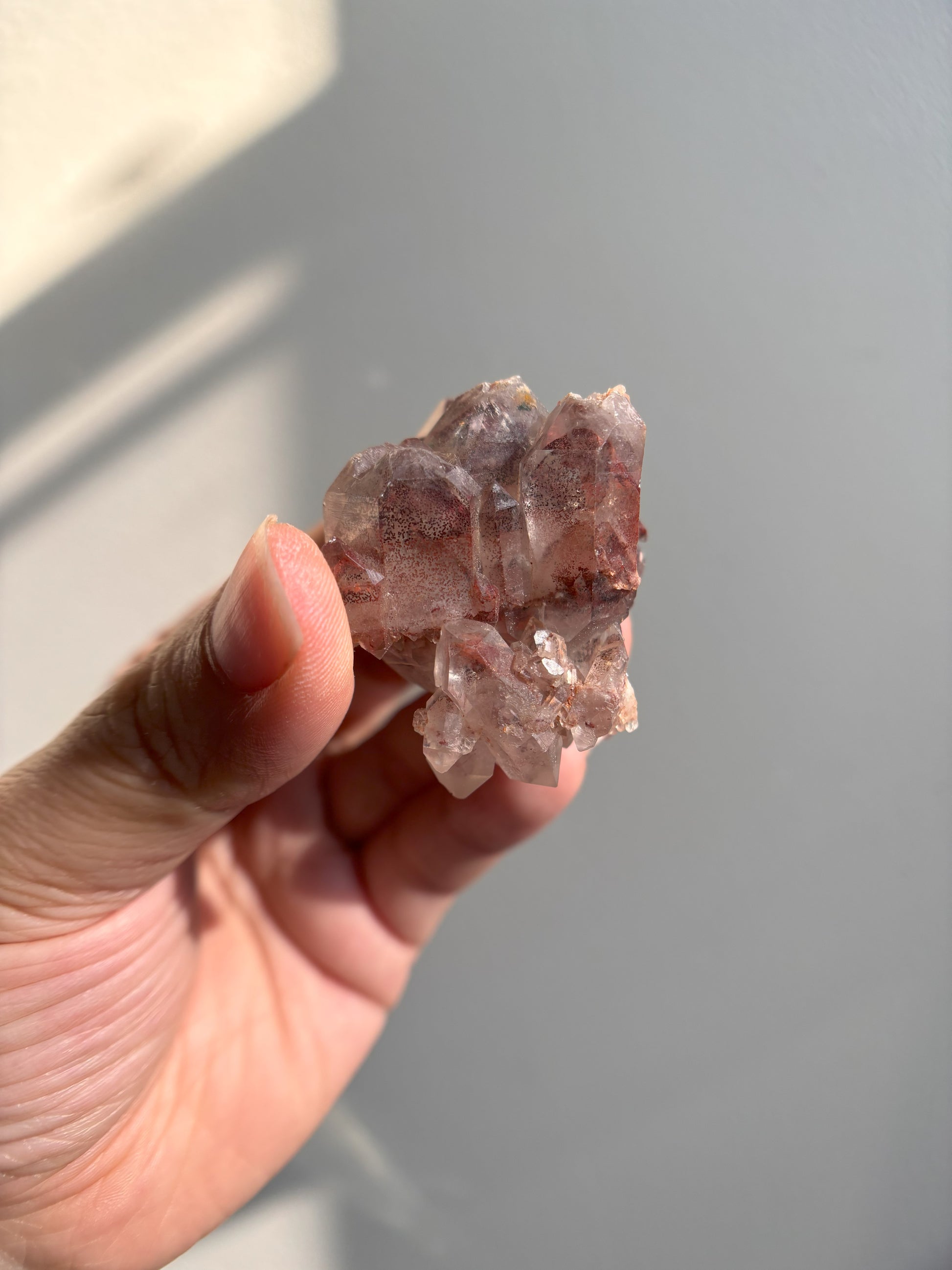 This Red Phantom Quartz, named "Ishuko," draws its fiery power from the red hematite inclusions, symbolizing the flames of one's transformation and inner strength. Ishuko reminds you that like a fireplace, your core holds an eternal fire, capable of burning away the old and igniting new life and direction.
