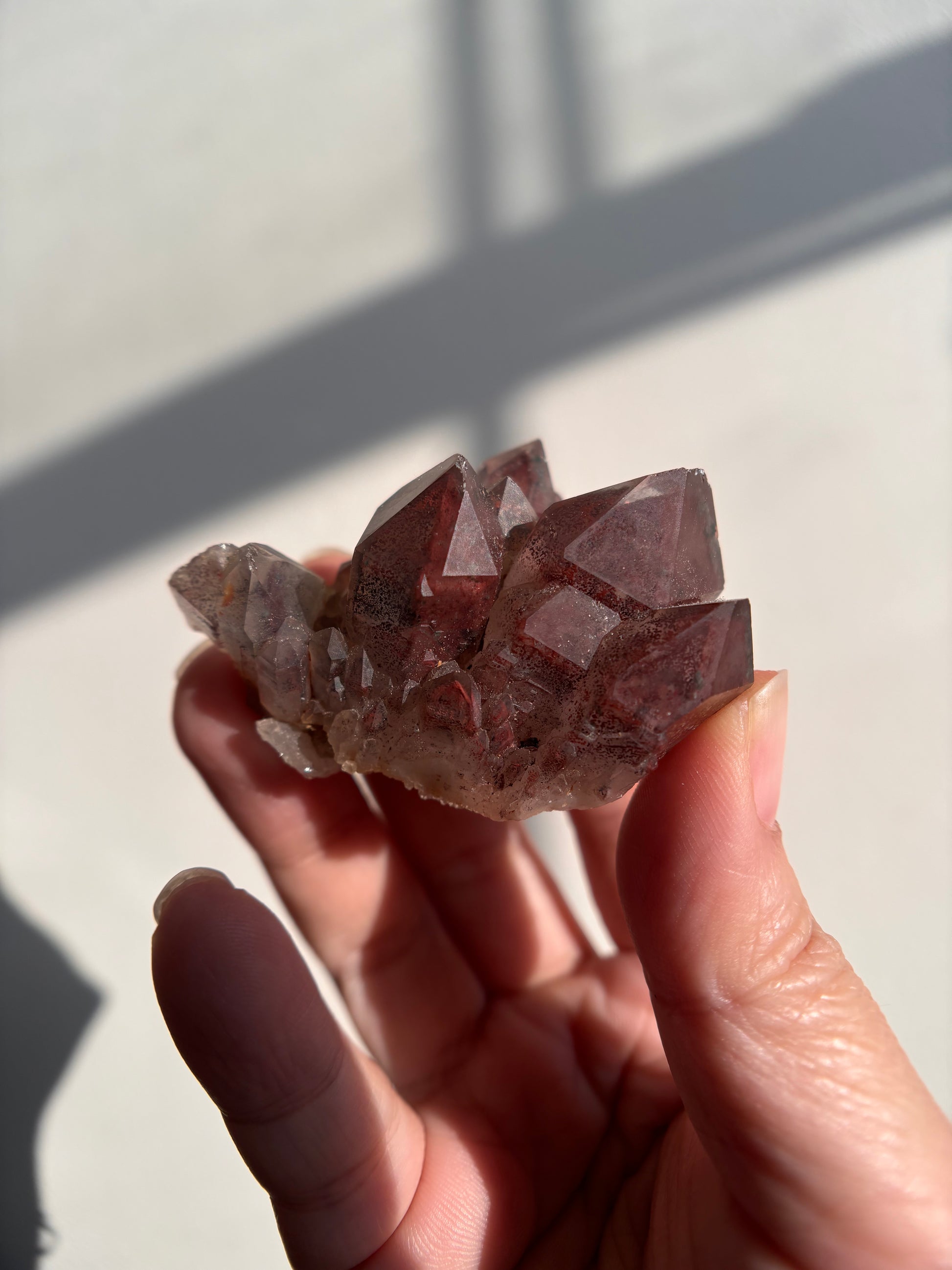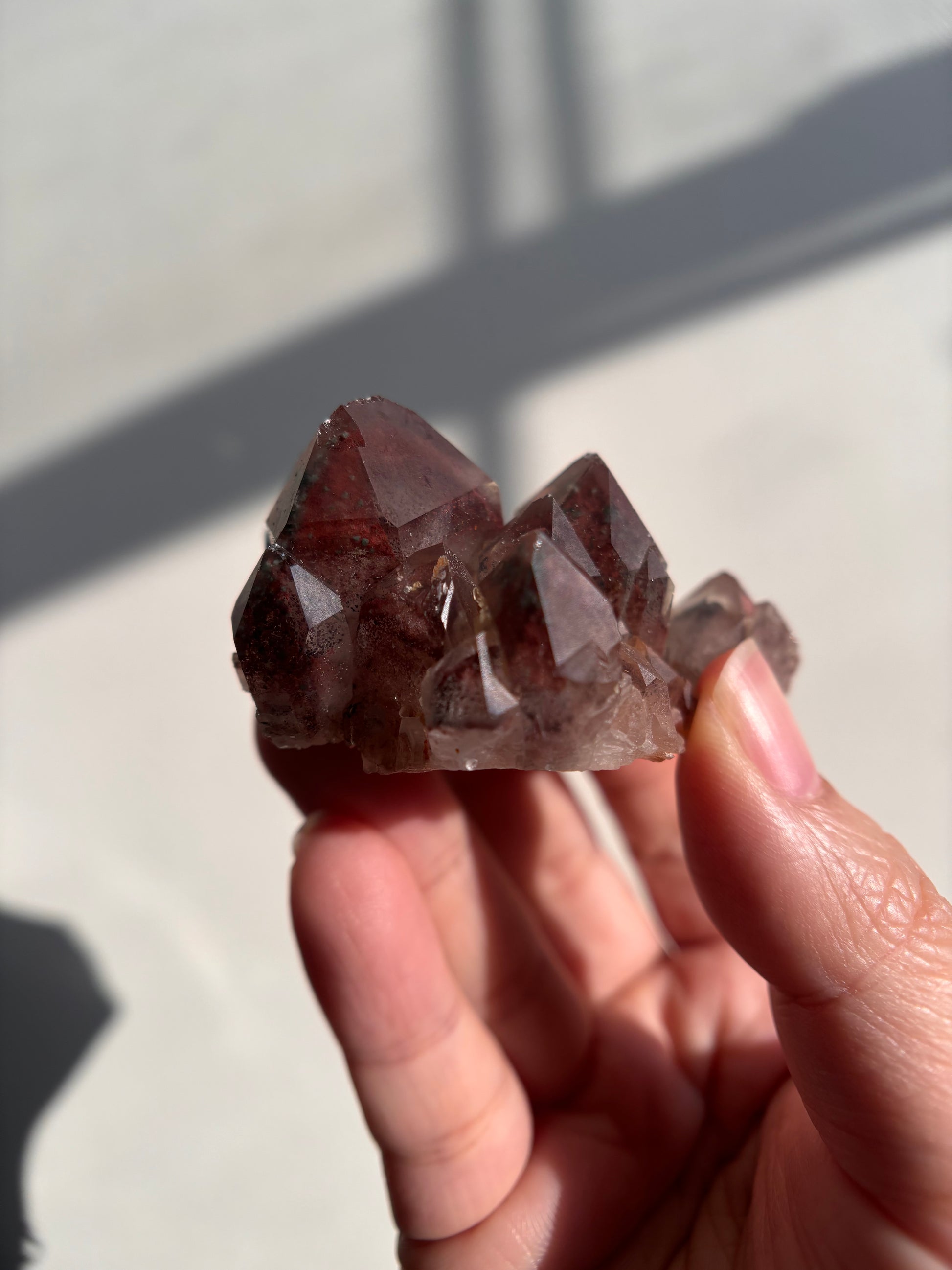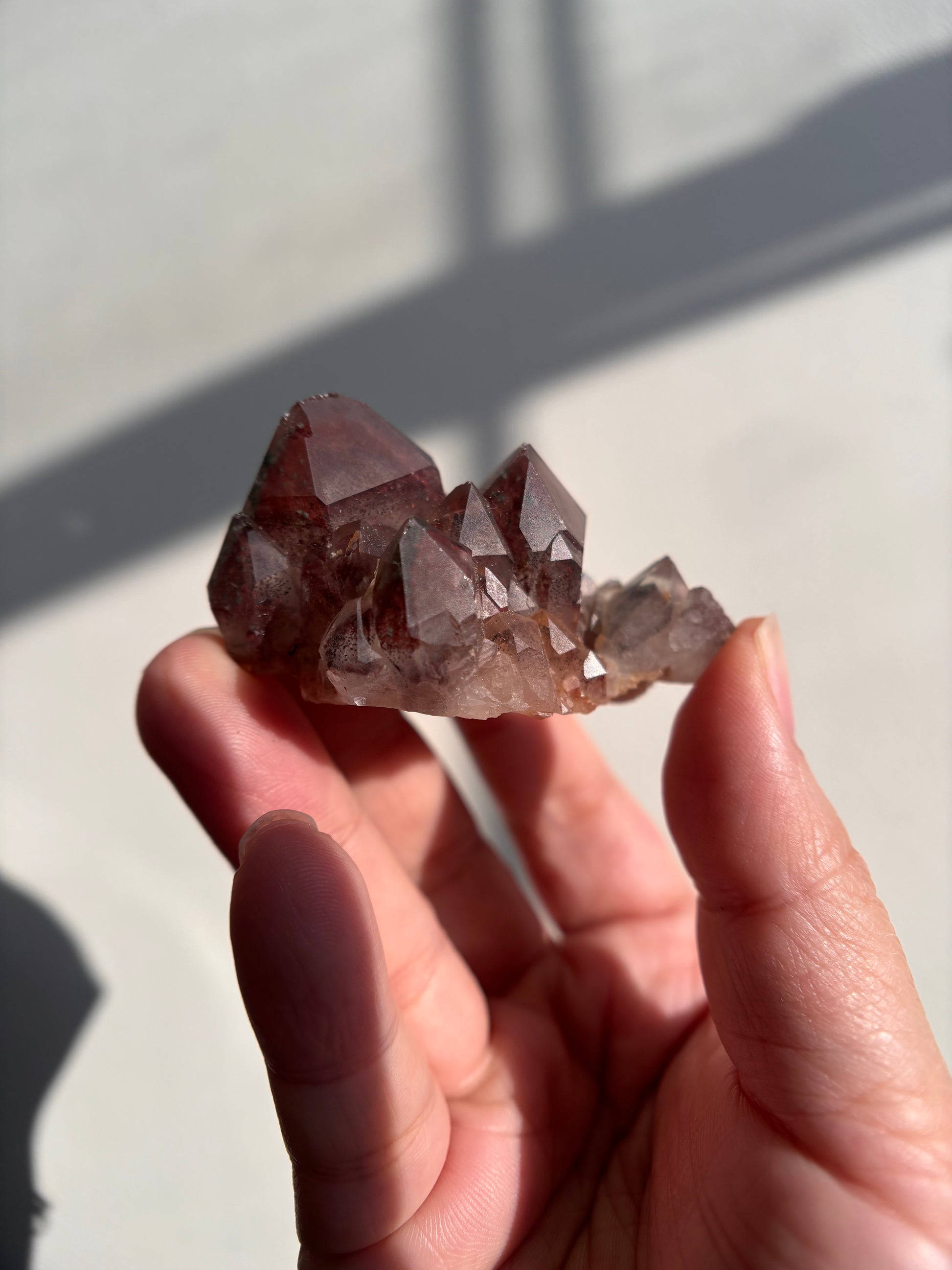 This Red Phantom Quartz, named "Ishuko," draws its fiery power from the red hematite inclusions, symbolizing the flames of one's transformation and inner strength. Ishuko reminds you that like a fireplace, your core holds an eternal fire, capable of burning away the old and igniting new life and direction.