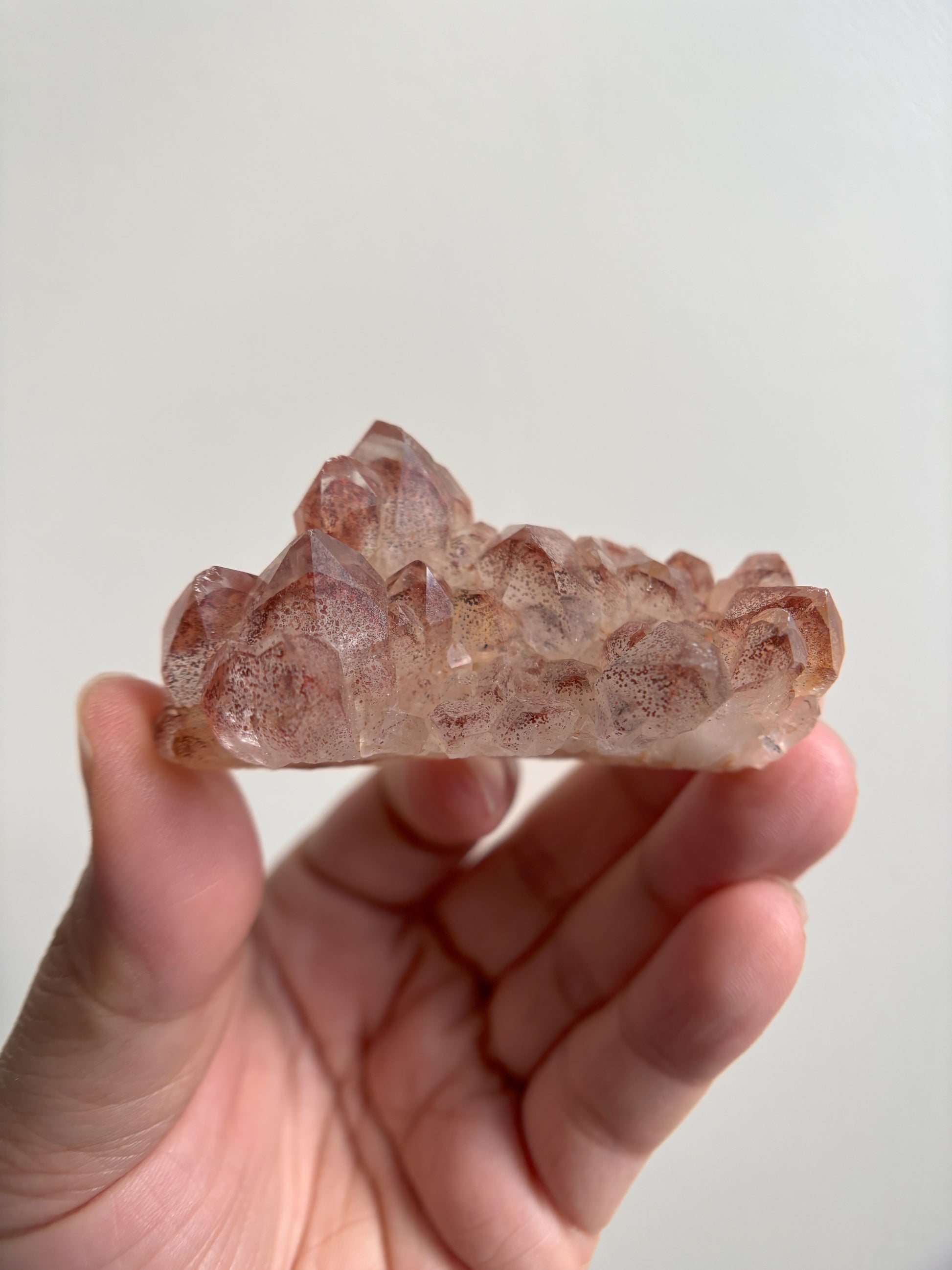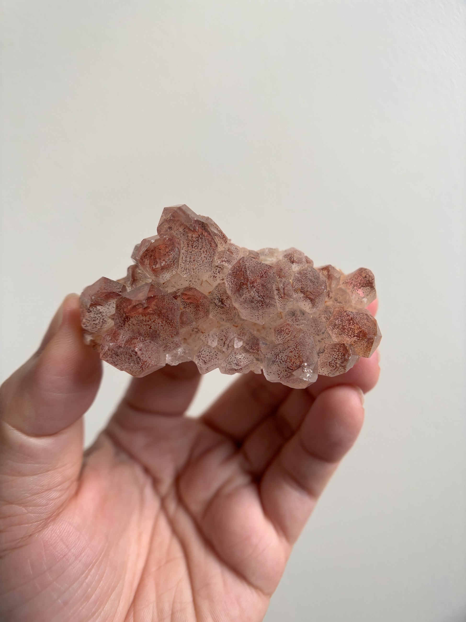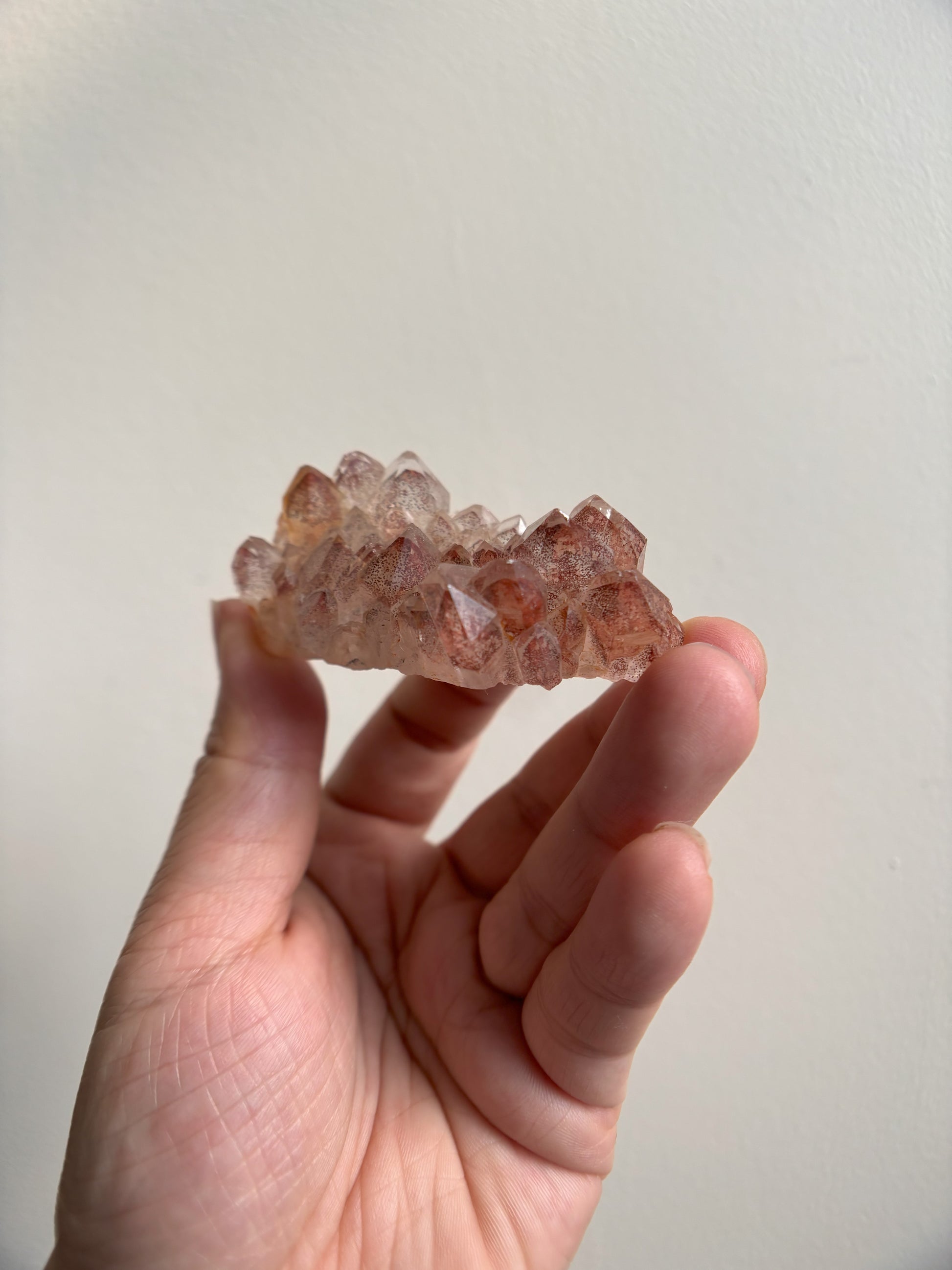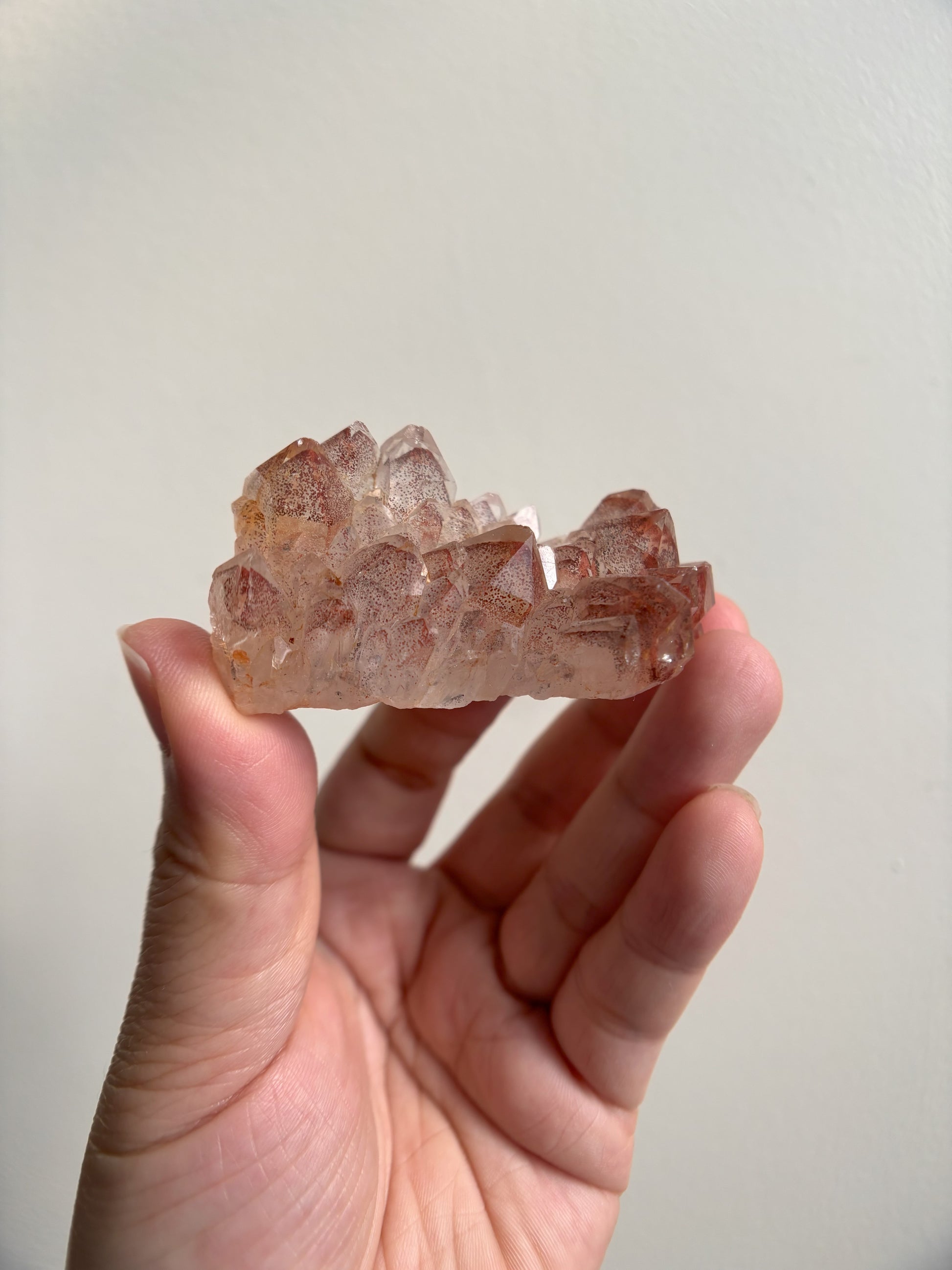 This Red Phantom Quartz, named "Ishuko," draws its fiery power from the red hematite inclusions, symbolizing the flames of one's transformation and inner strength. Ishuko reminds you that like a fireplace, your core holds an eternal fire, capable of burning away the old and igniting new life and direction.