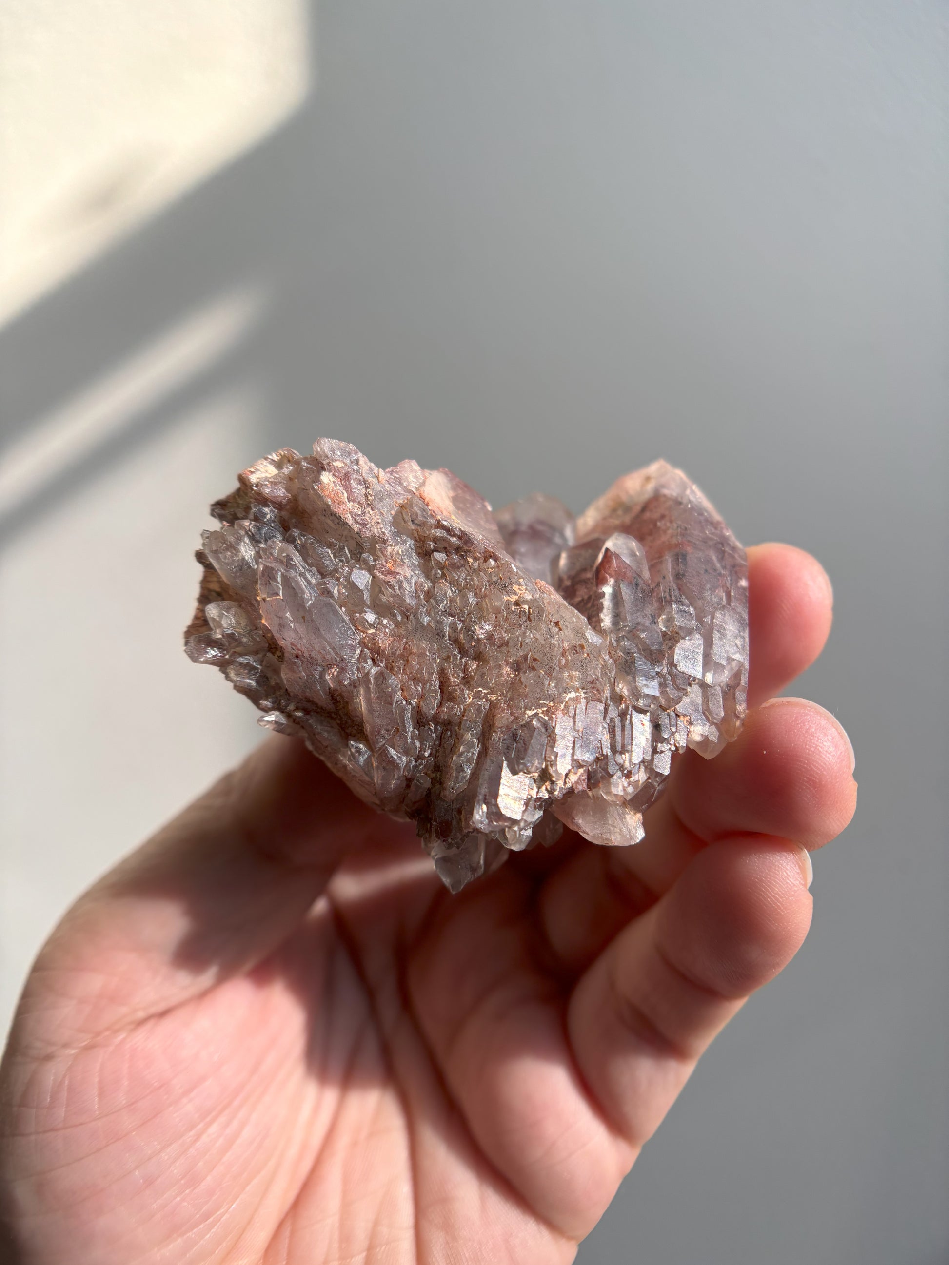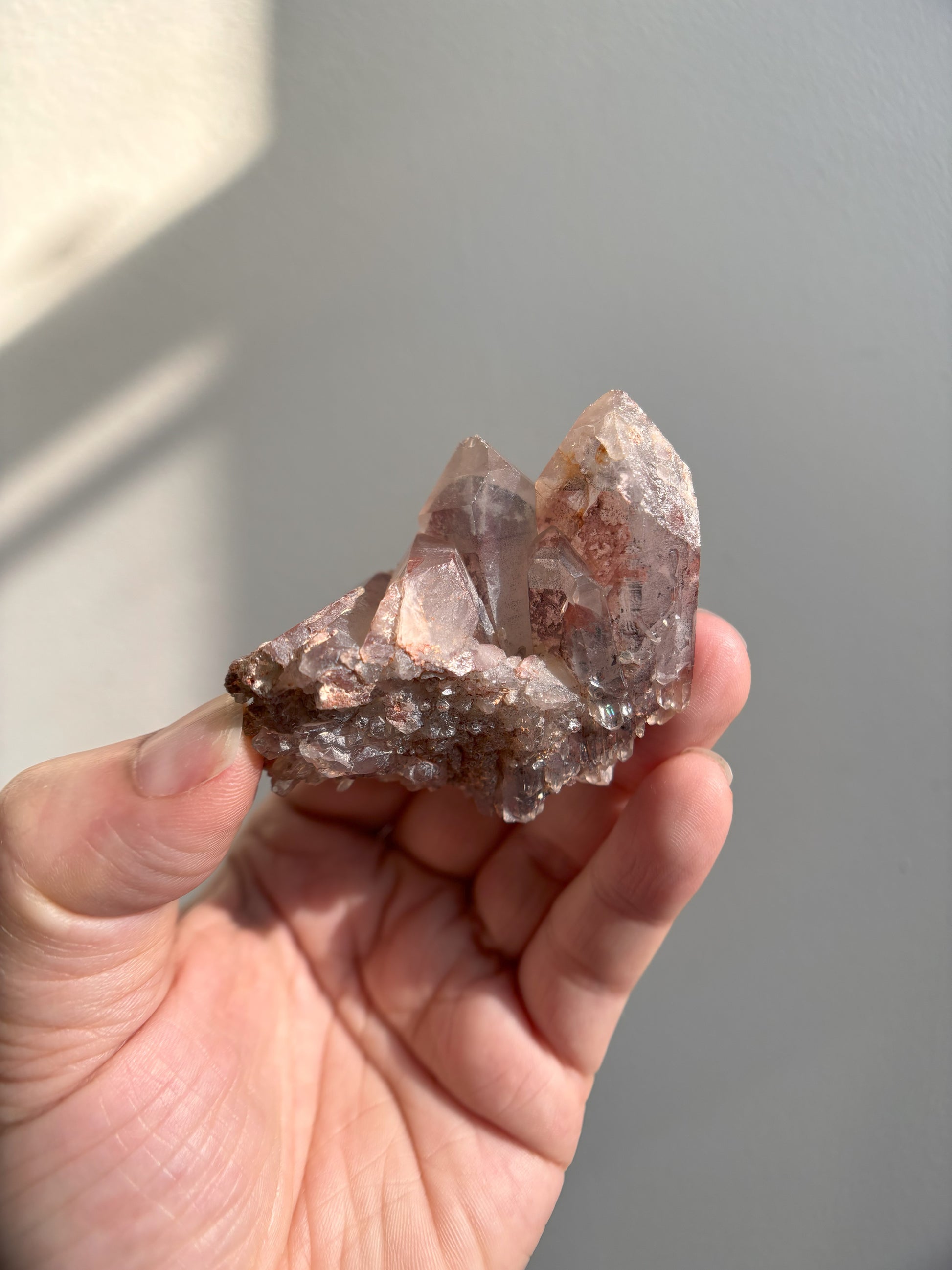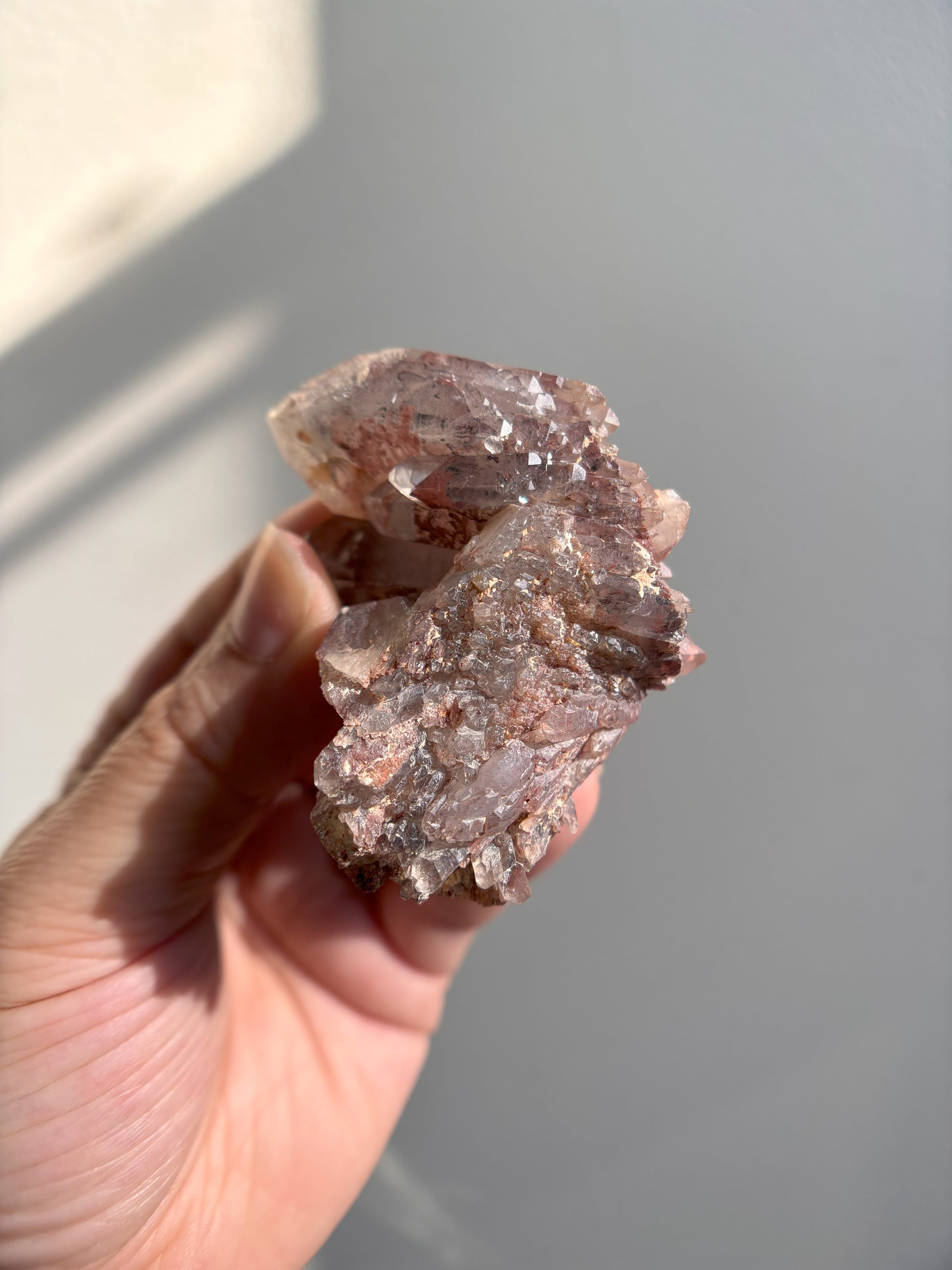 This Red Phantom Quartz, named "Ishuko," draws its fiery power from the red hematite inclusions, symbolizing the flames of one's transformation and inner strength. Ishuko reminds you that like a fireplace, your core holds an eternal fire, capable of burning away the old and igniting new life and direction.