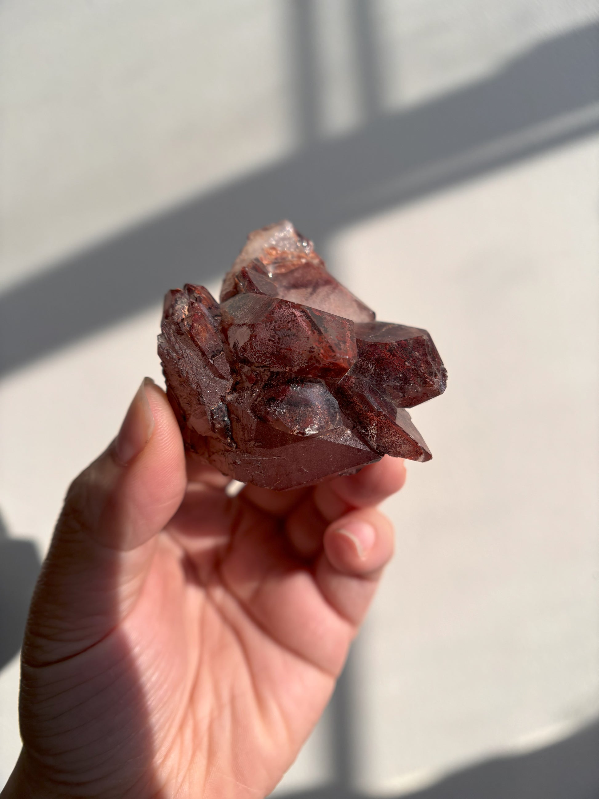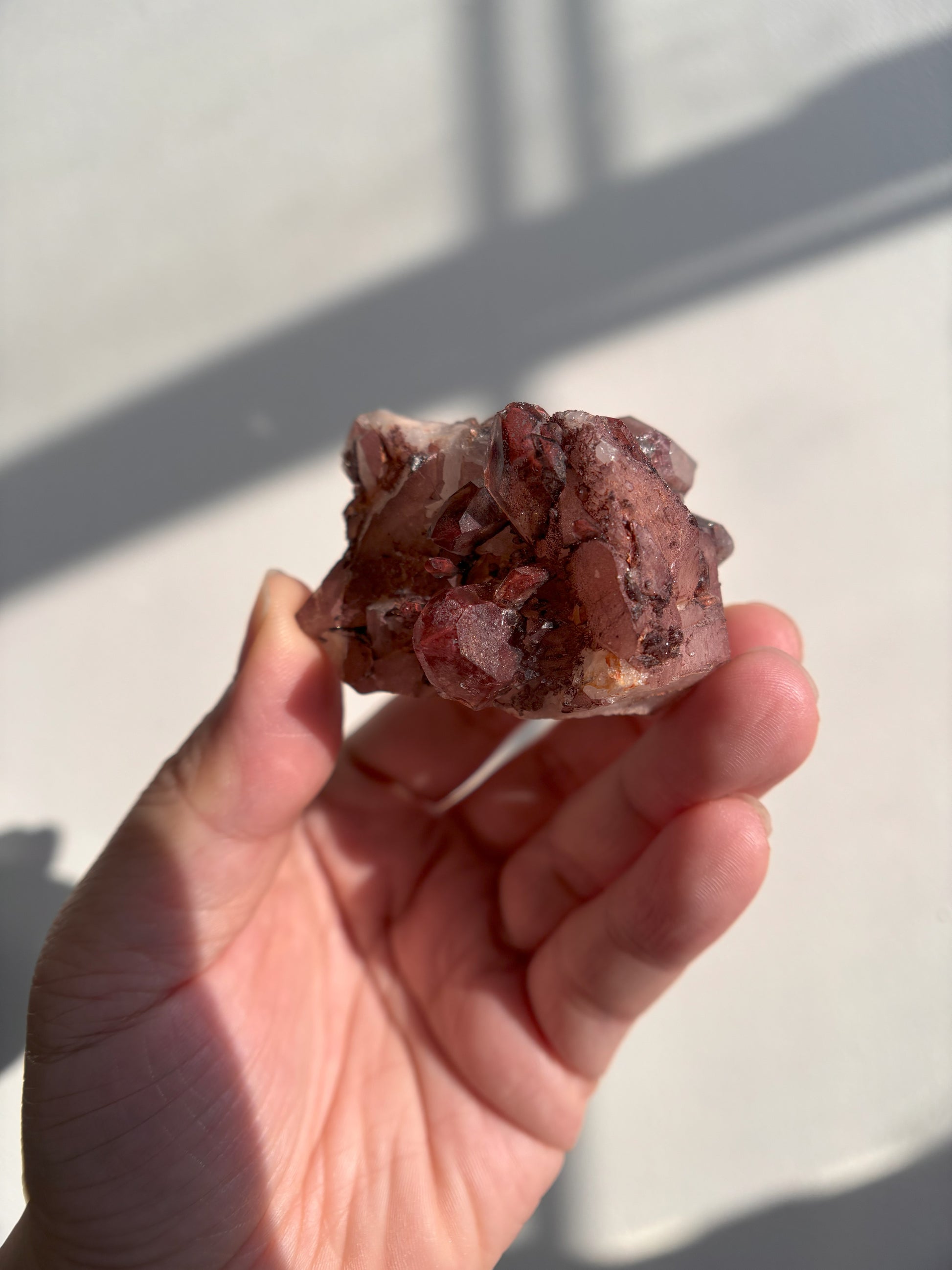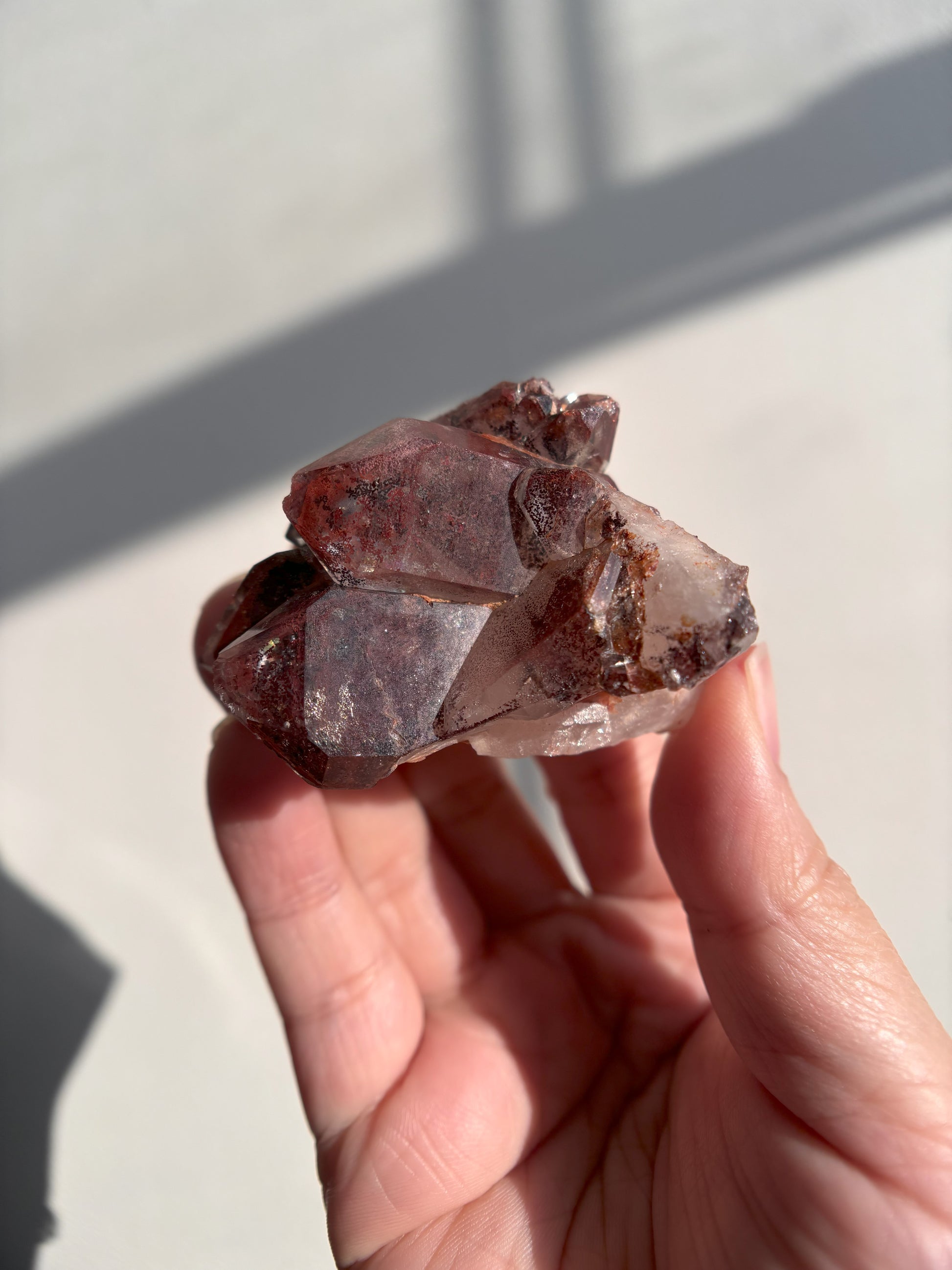 This Red Phantom Quartz, named "Ishuko," draws its fiery power from the red hematite inclusions, symbolizing the flames of one's transformation and inner strength. Ishuko reminds you that like a fireplace, your core holds an eternal fire, capable of burning away the old and igniting new life and direction.