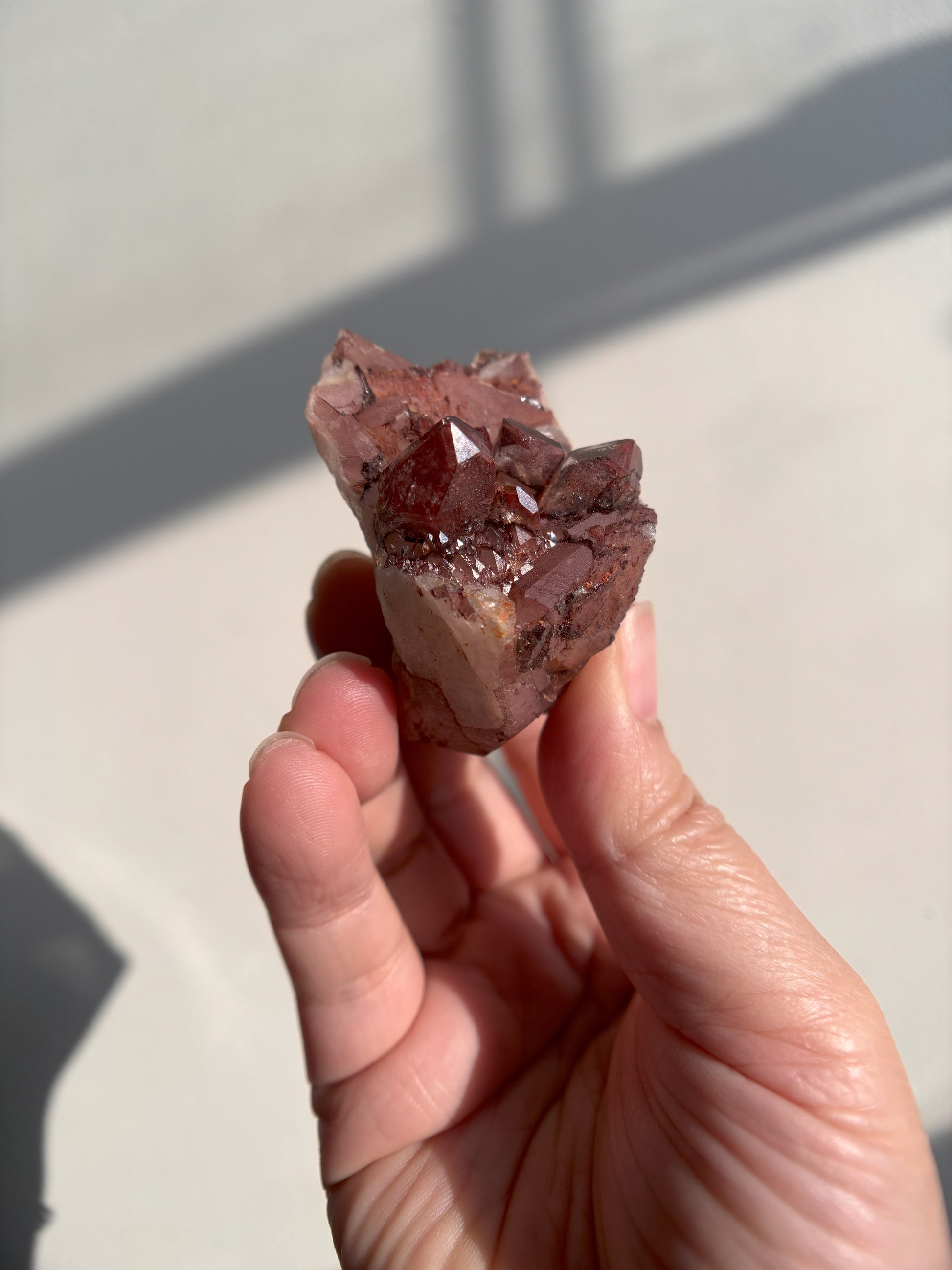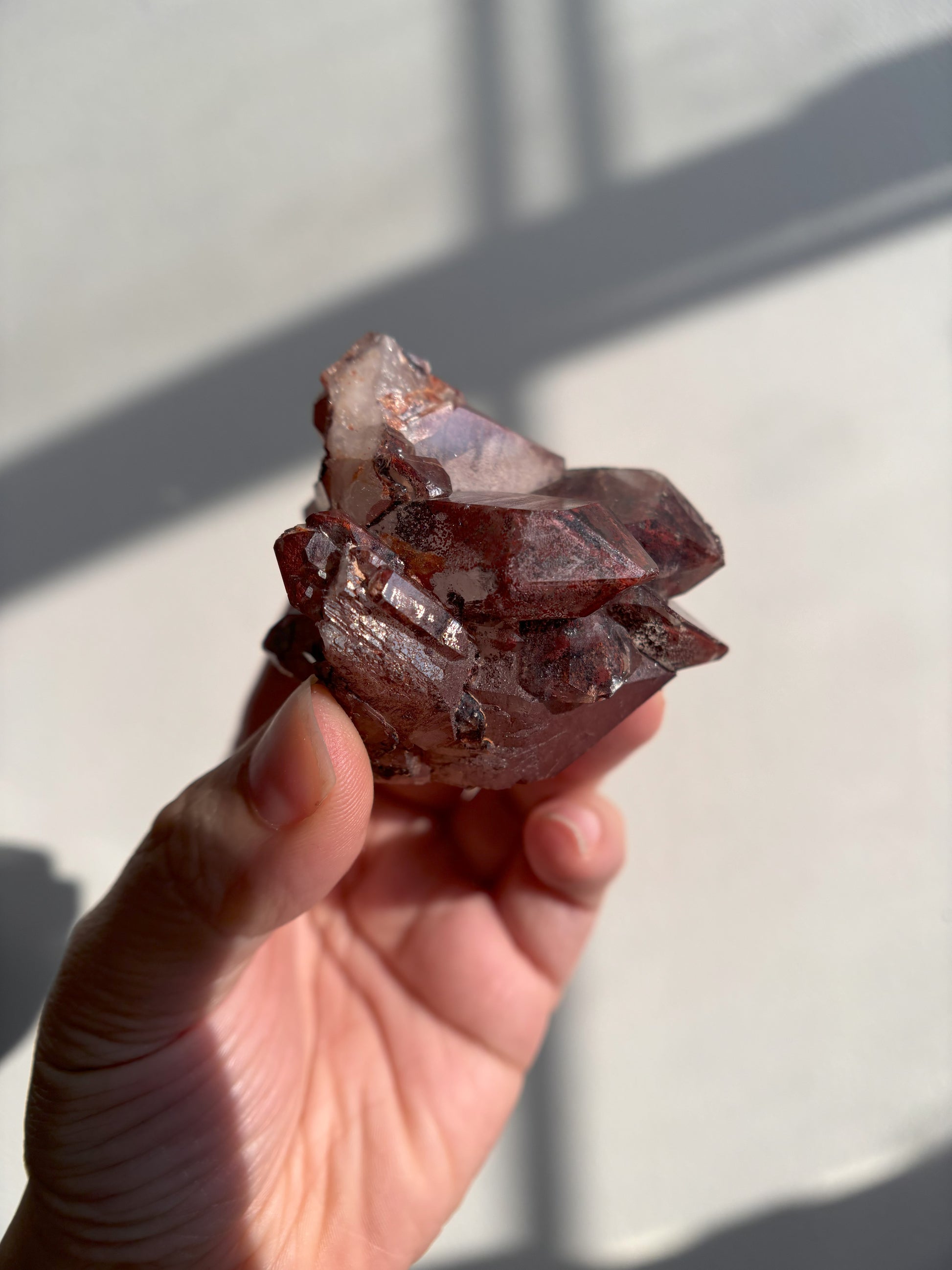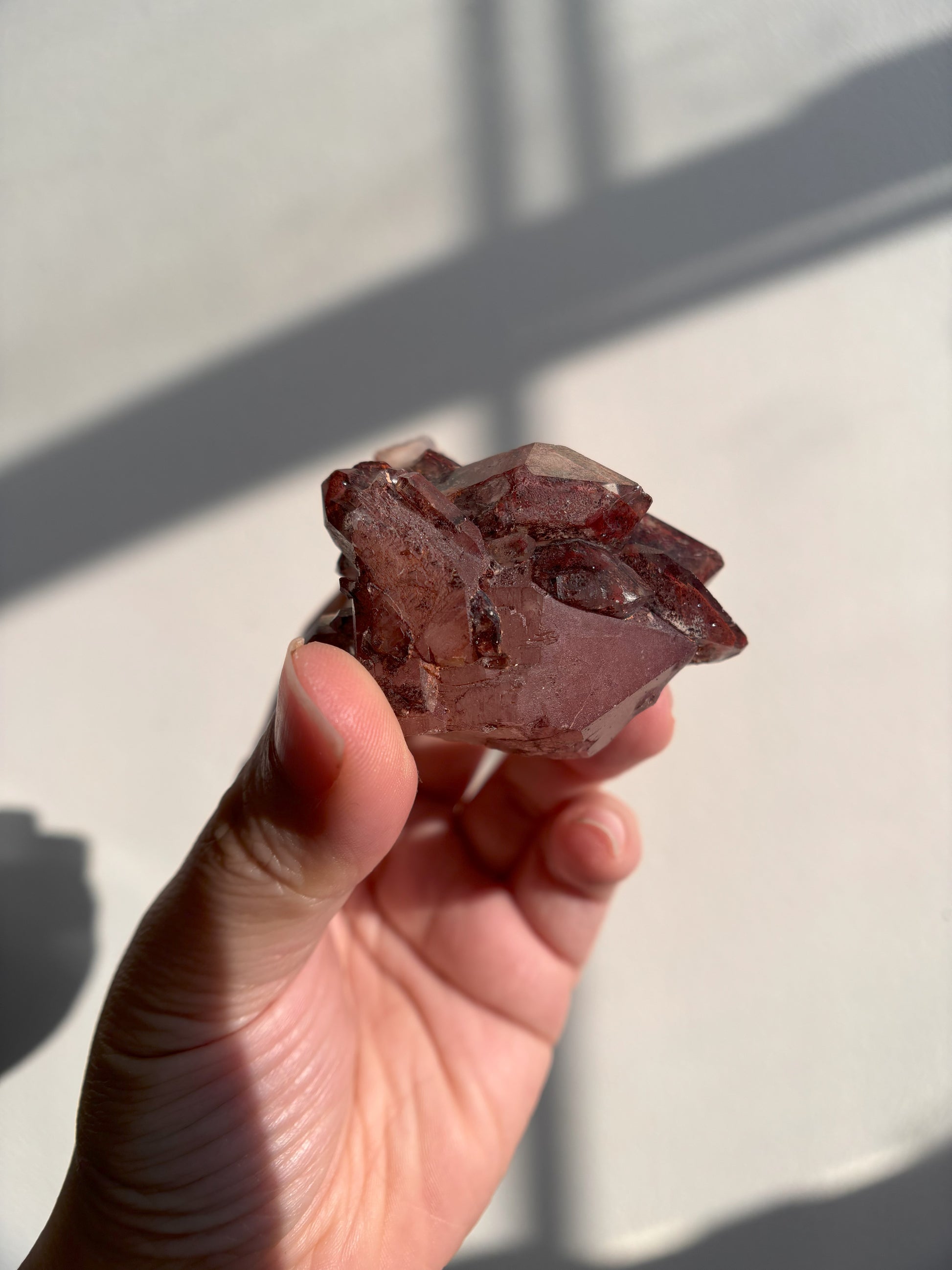This Red Phantom Quartz, named "Ishuko," draws its fiery power from the red hematite inclusions, symbolizing the flames of one's transformation and inner strength. Ishuko reminds you that like a fireplace, your core holds an eternal fire, capable of burning away the old and igniting new life and direction.