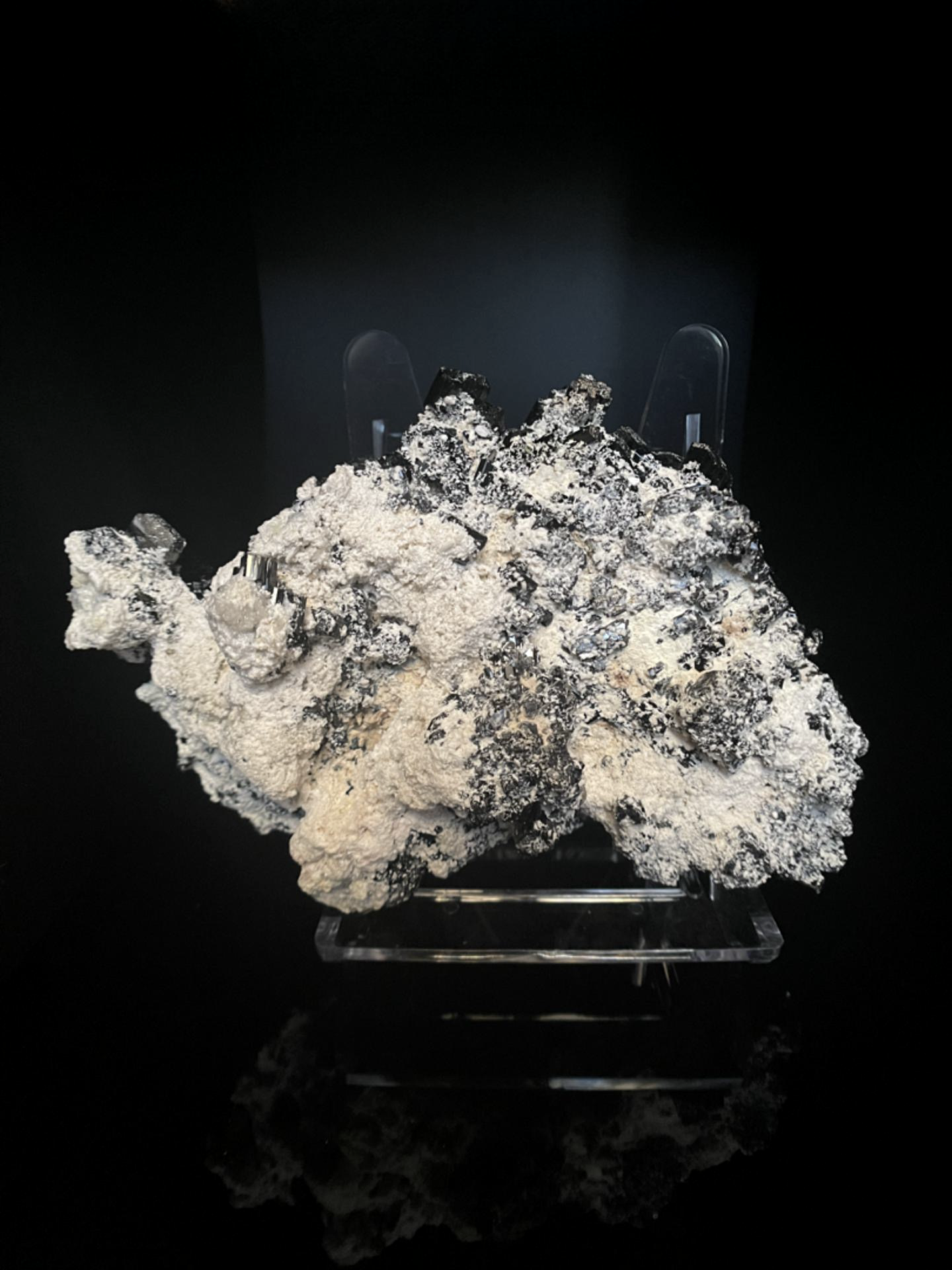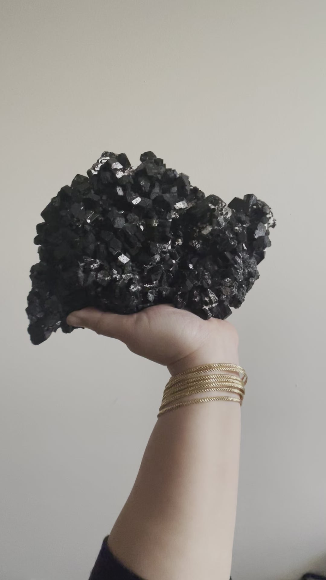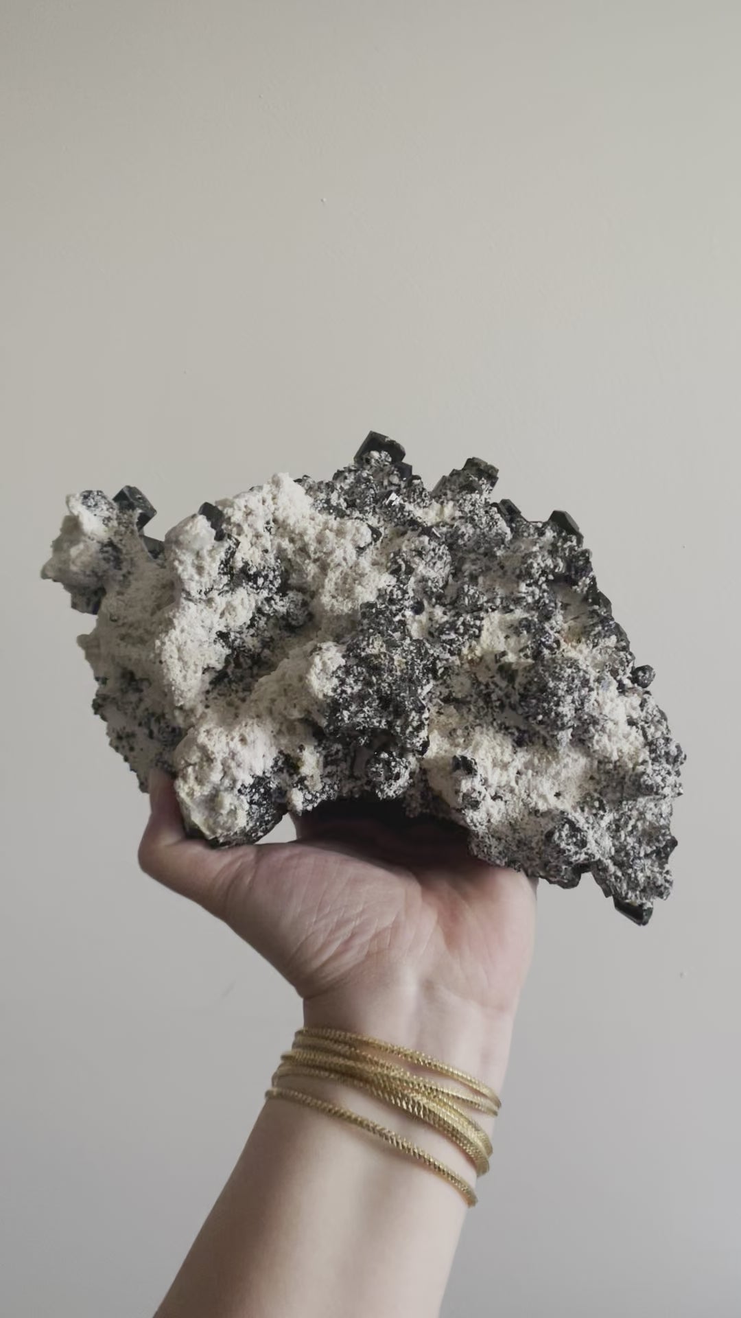 This Namibian Black Tourmaline statement piece has Calcite. This mix enhances Black Tourmaline’s power and capabilities. It is known to be a negative energy transmuter and guardian, by driving destructive energy out of your environment and purifying it, while also protecting your auric field. It also helps one to think more clearly, have more focus and self-awareness, and to journey forward knowing negative energy cannot stop or slow you down.