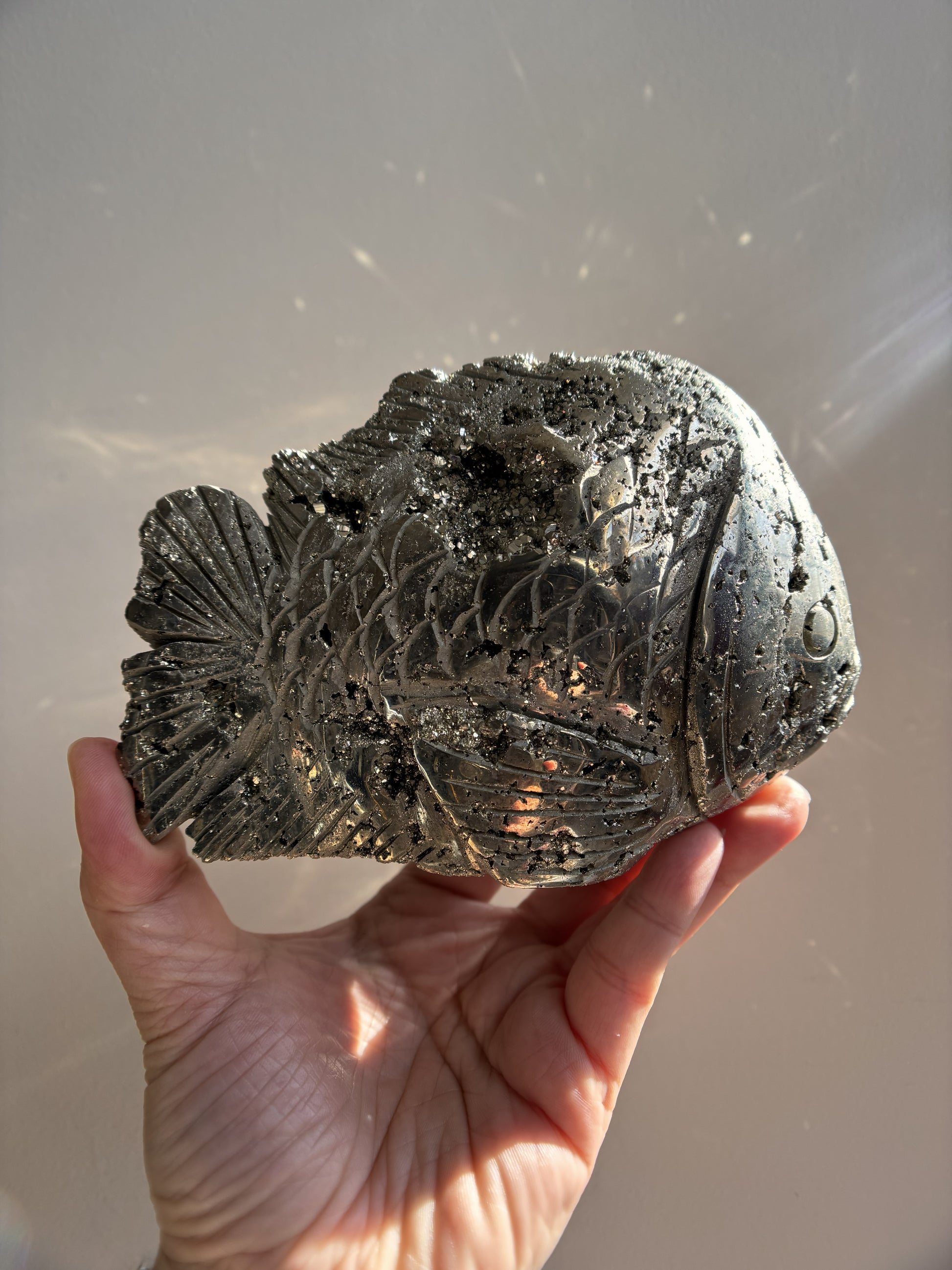 Pyrite Fish is a symbolic prosperity form that supports protection while strengthening confidence and personal resolve. Pyrite is known for reinforcing self‑reliance and inner strength, helping guard against draining or destructive energy while restoring motivation that may have been worn down over time. Carved into a fish, this piece emphasizes flow and sustained abundance rather than force or urgency. It supports steady growth, resilience, and the ability to move forward with confidence, making it well suited for placement in spaces connected to work, finances, or long‑term goals.