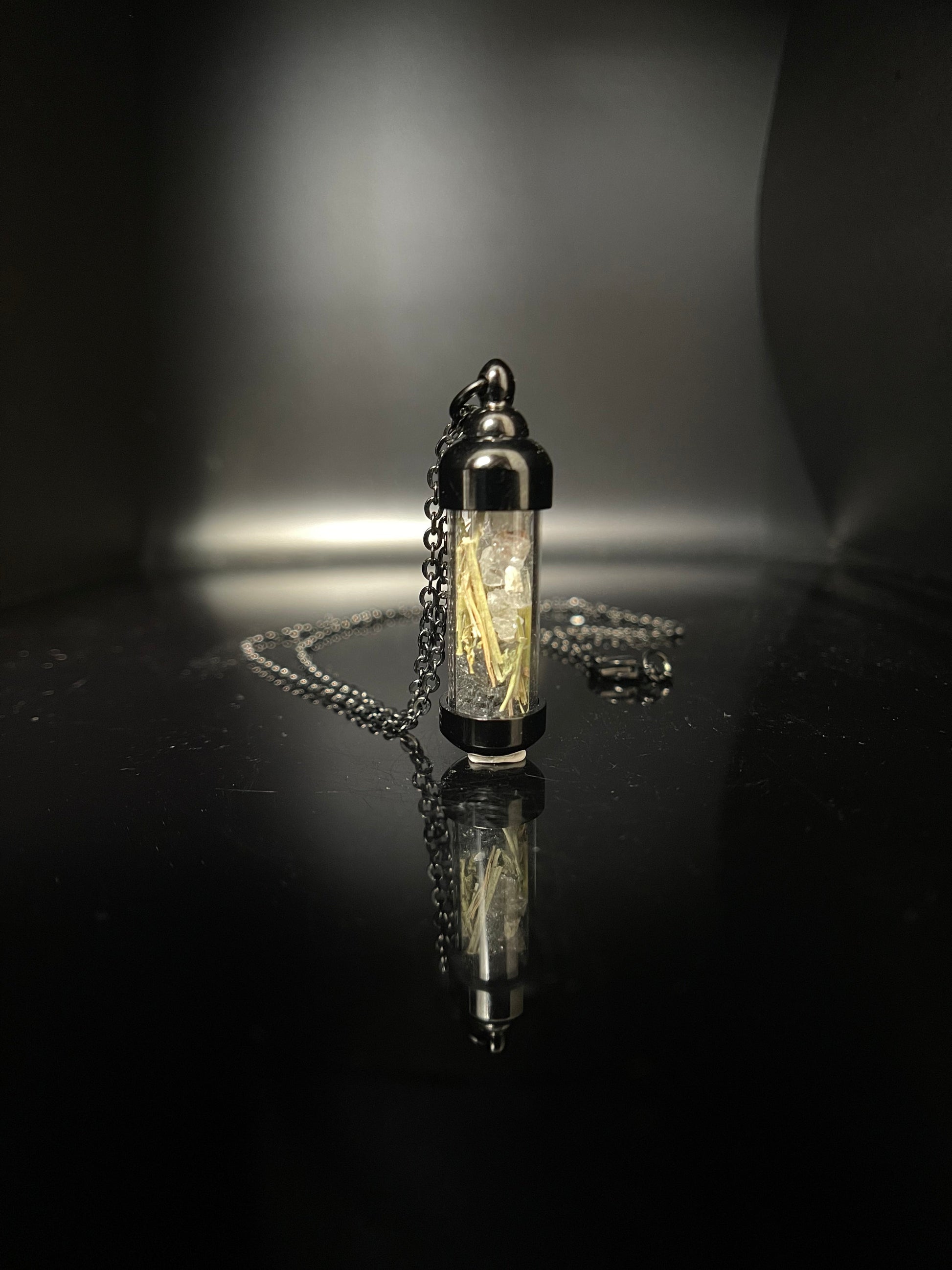 A silver stainless steel with a 22 inch chain vial necklace containing Hyalite Opal, Black Obsidian dust, and Eyebright herbs. It helps reveal anything unseen – such as intentions, purposes, and energy – in order to protect and prepare its carrier for any situation or relationship.